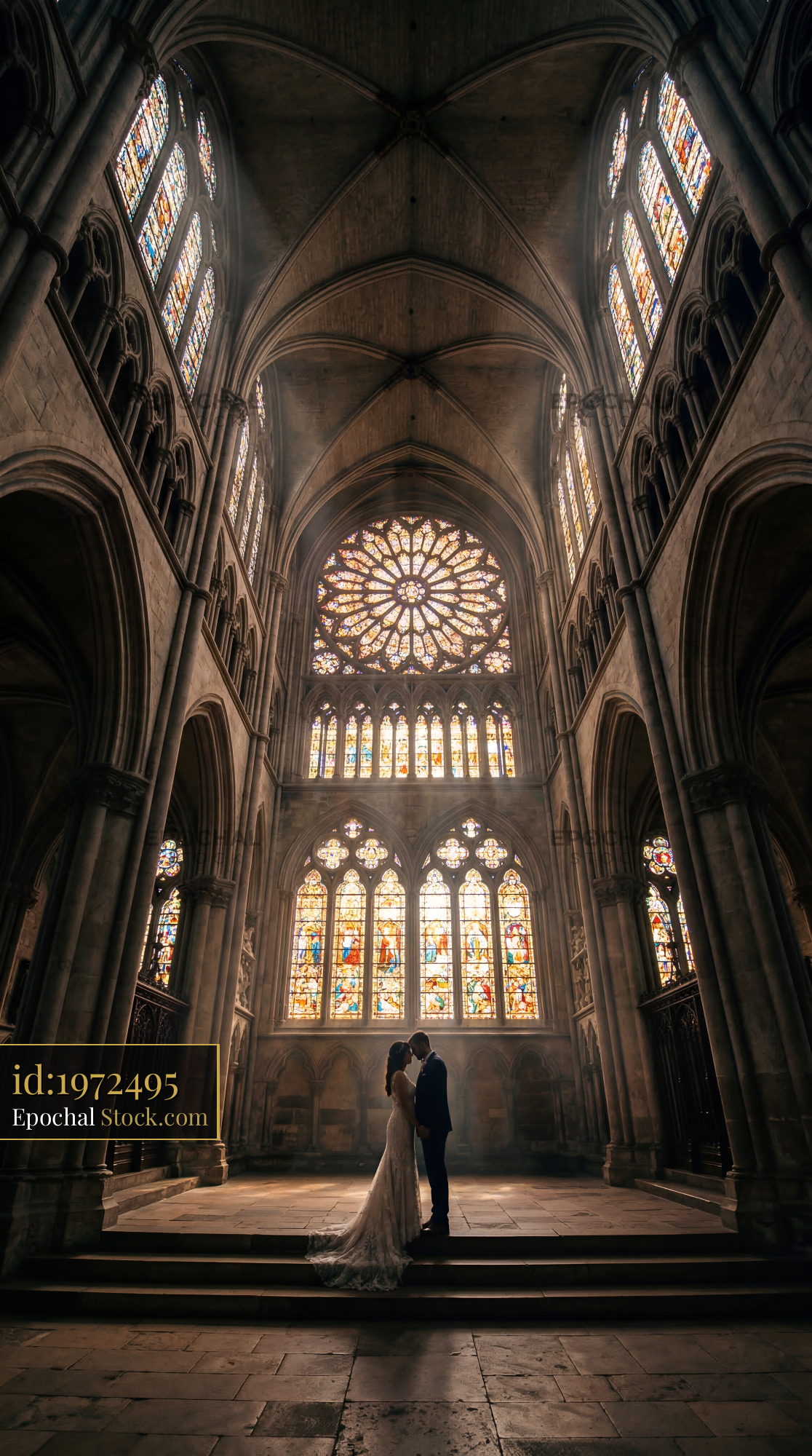 A couple stands close together inside a large cathedral. Sunlight shines through colorful stained glass windows, creating a warm atmosphere. The couple holds each other while embracing romantically.