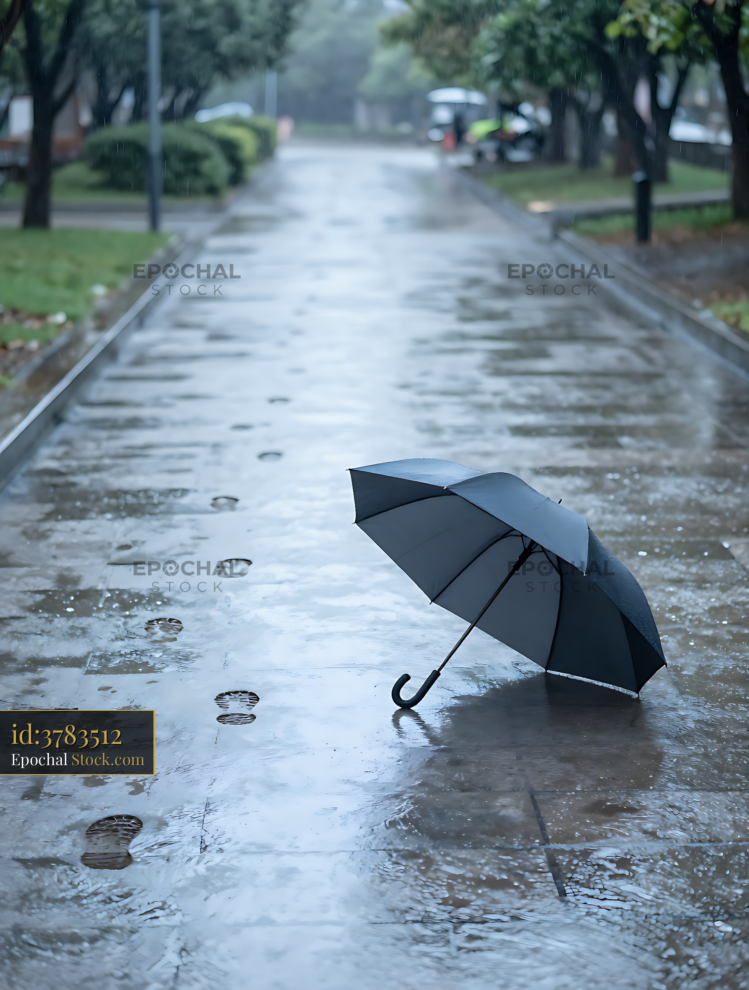 A black umbrella lies forgotten on a rainy sidewalk with wet footprints leading away, evoking themes of loneliness, sudden departure, and melancholy in an urban park setting.