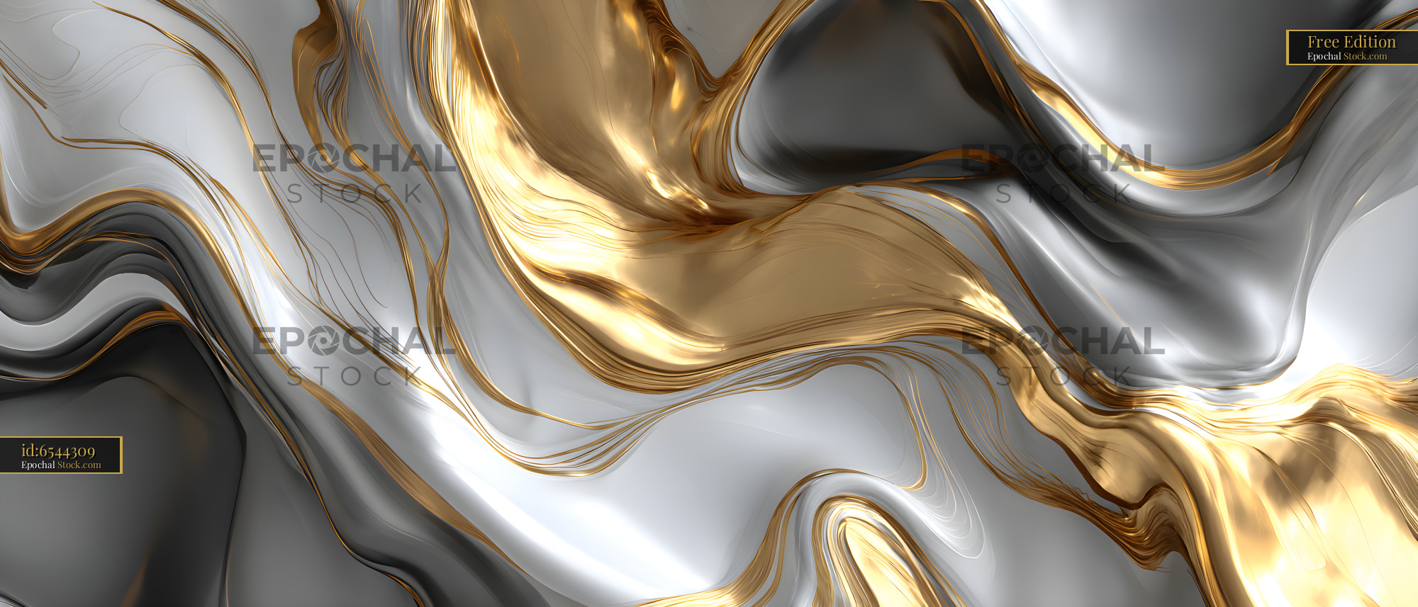 Swirling patterns in black, white, and gold. The colors mix together, creating smooth curves and flowing lines. The design appears modern and sleek.