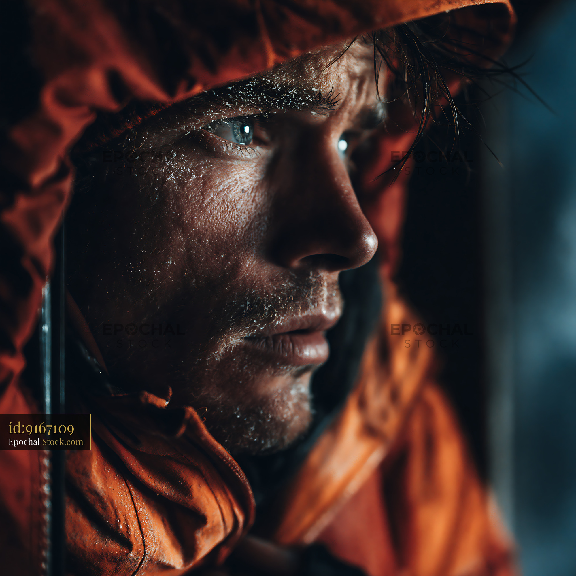 A bearded adult man gazes thoughtfully into the distance, illuminated by warm orange and golden light that contrasts with cool blue shadows. The dramatic backlighting and rain-soaked skin suggest resilience, introspection, and determination in the face of adversity.