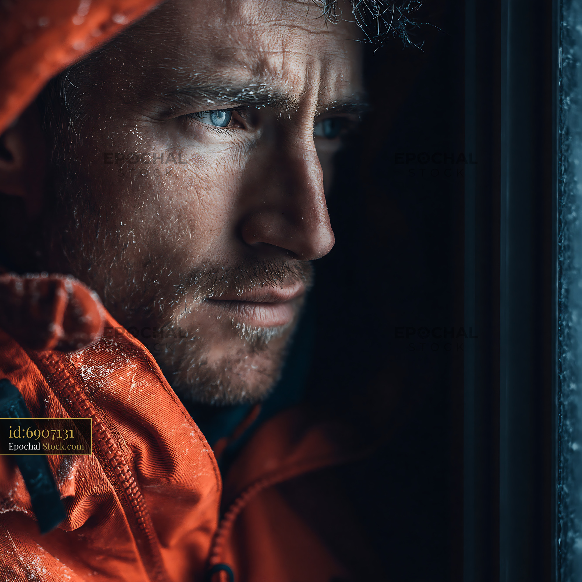 Adult man with frost on his face wearing an orange winter parka