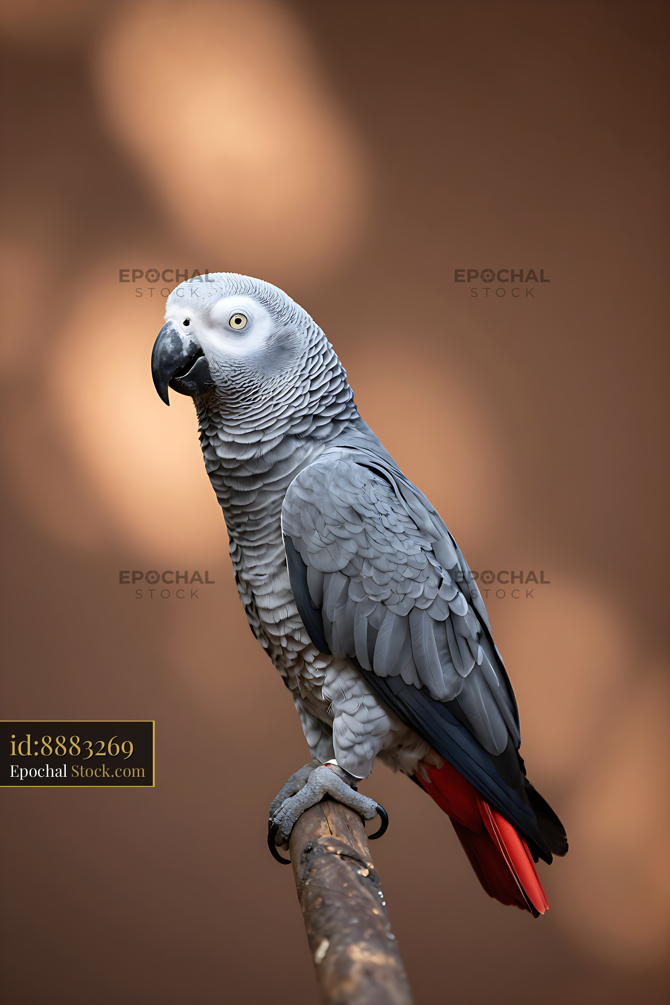 An intelligent African grey parrot sits calmly on a wooden perch, highlighting its detailed grey plumage and vibrant red tail feathers against a soft, warm background.