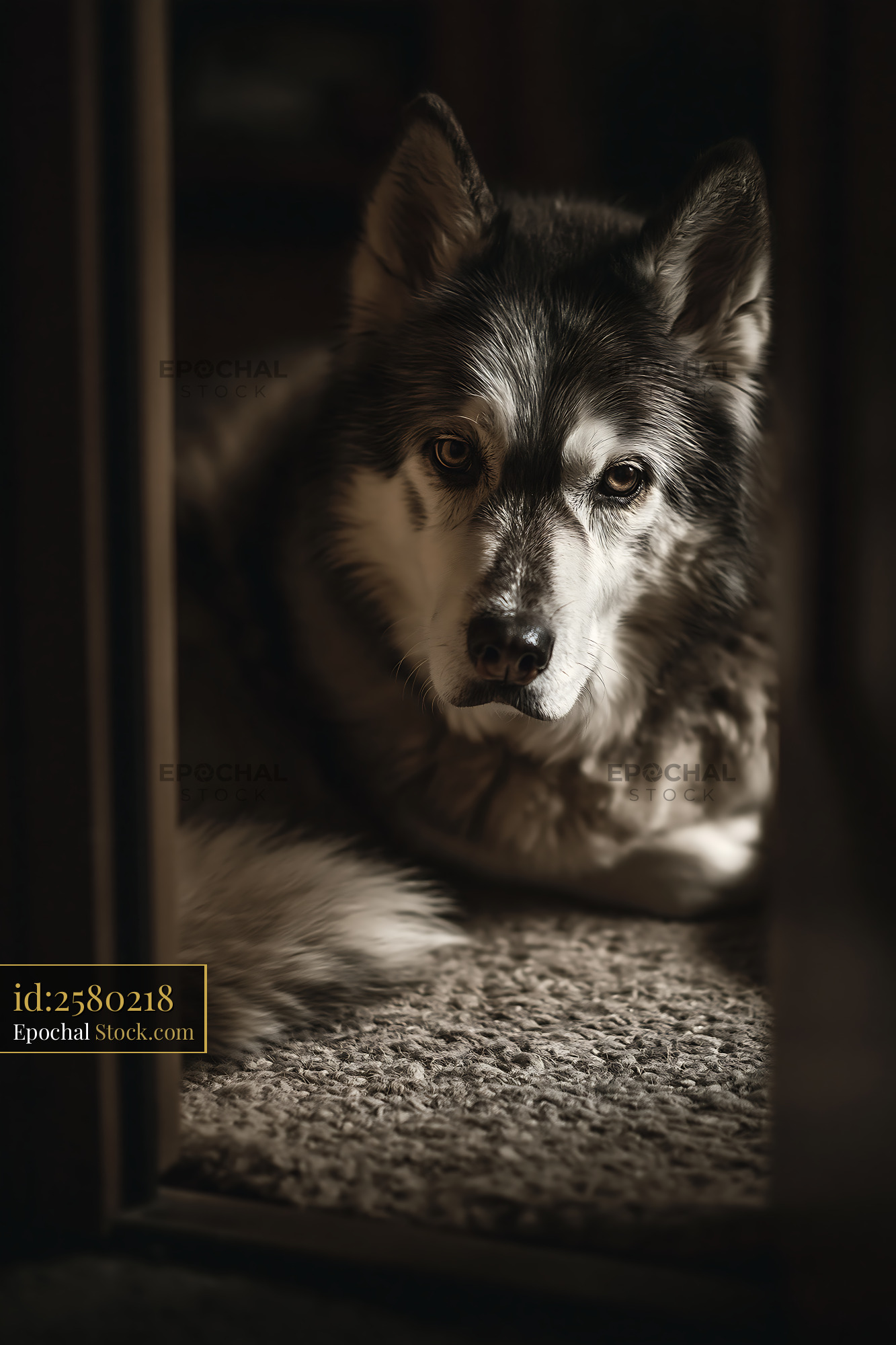 A soulful Alaskan malamute rests in the shadows of a doorway, looking directly at the camera with deep, expressive eyes. The moody lighting emphasizes a sense of loyalty, patience, and quiet companionship.