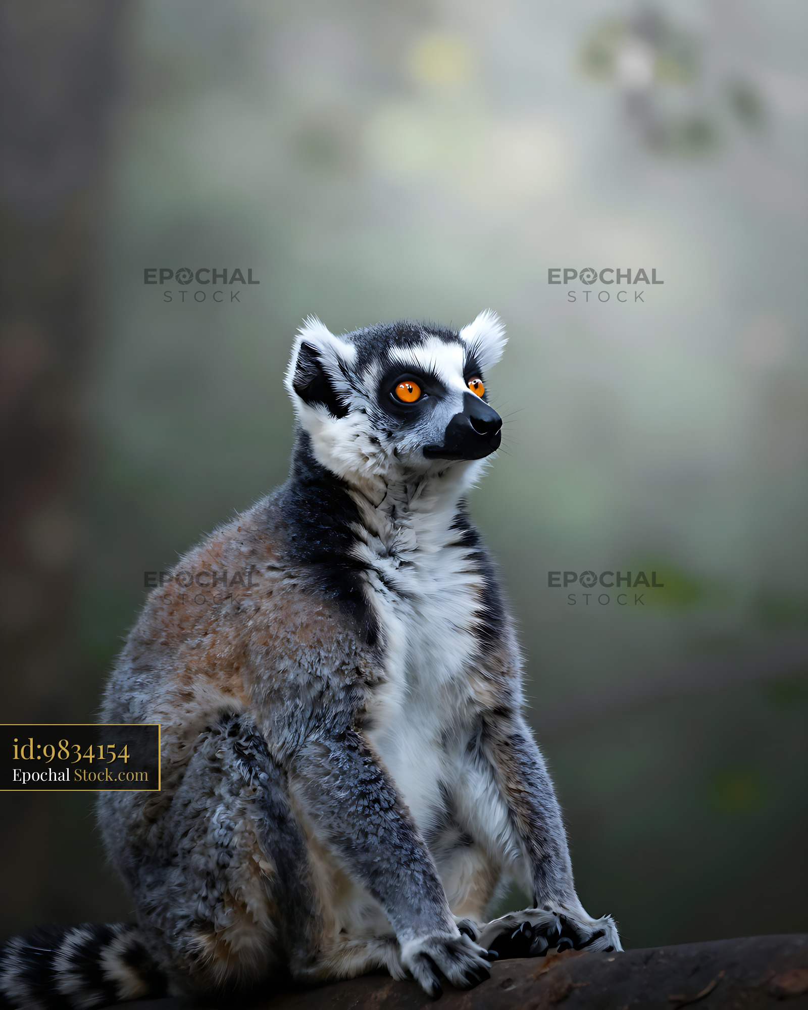 A ring-tailed lemur sits attentively on a log, its striking orange eyes gazing into the distance against a soft bokeh forest background, capturing a moment of quiet curiosity and wildlife.
