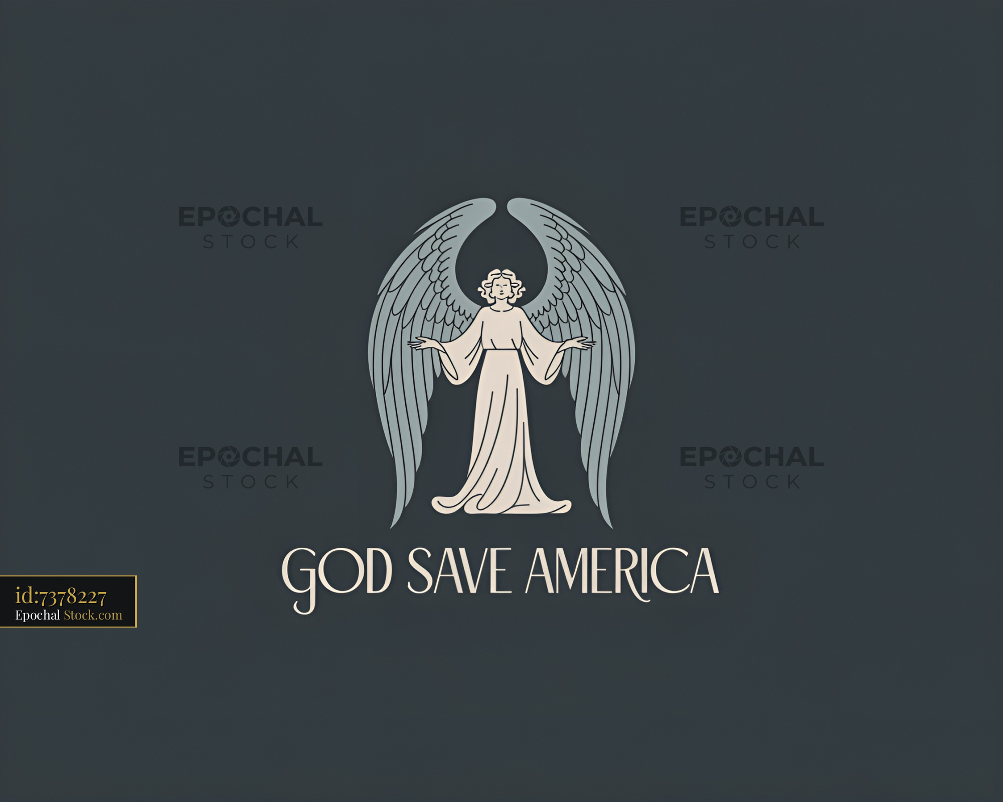 An angel figure with large wings holds its arms out in an upward position. The text below reads God Save America. The setting is a simple dark background that highlights the angel.