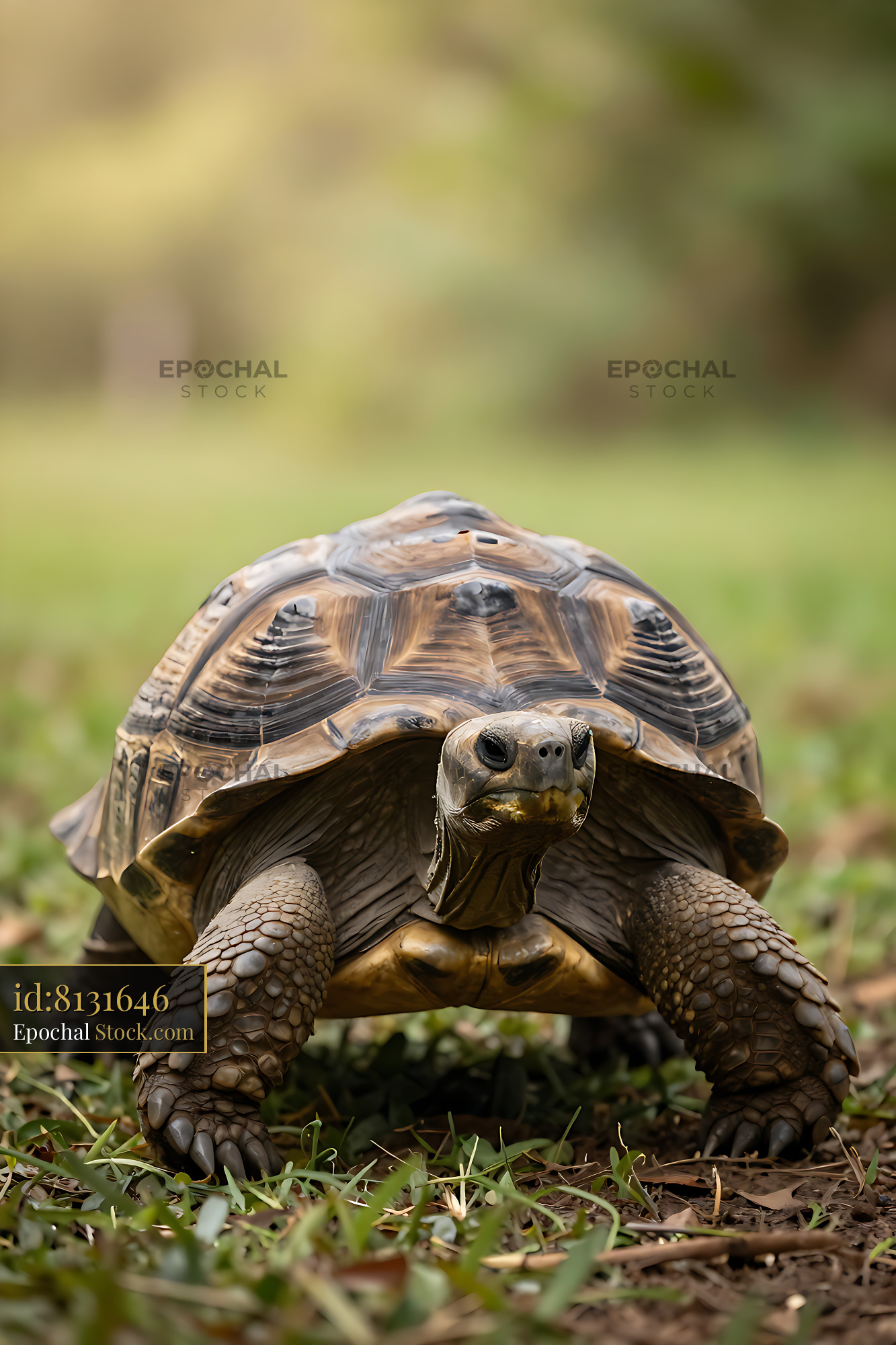 Ancient tortoise walking across green grass with determined gaze
