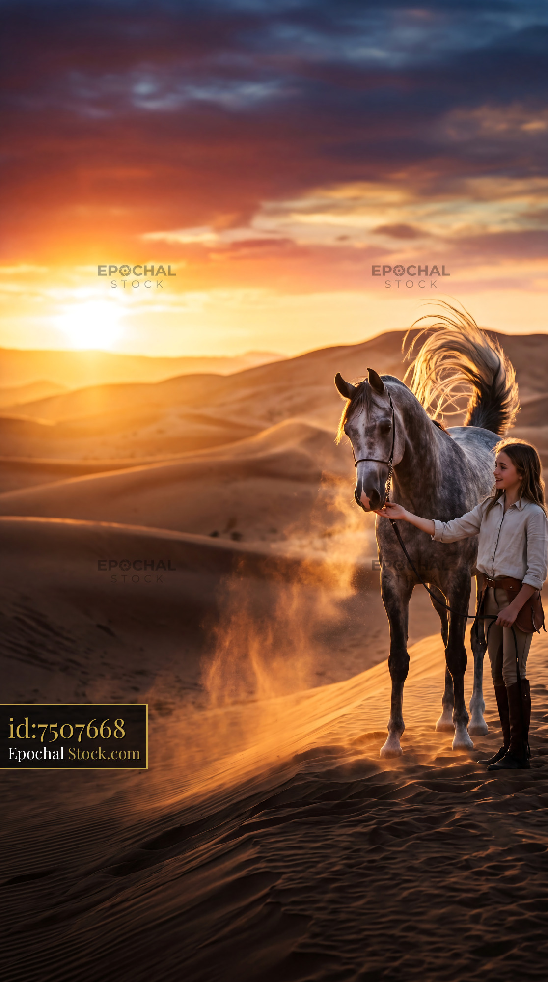 Arabian Stallion Nuzzling Rider Sunset Desert