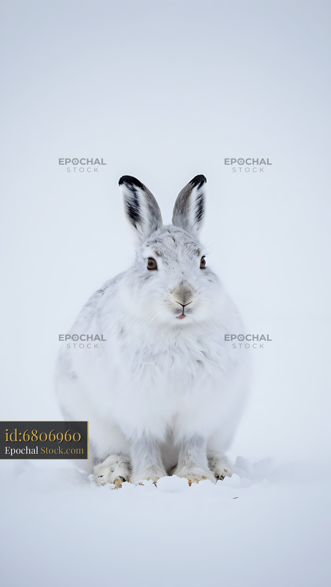 A fluffy arctic hare sits perfectly still in a vast snowy landscape, showcasing its white winter camouflage and black-tipped ears in a minimalist winter scene.