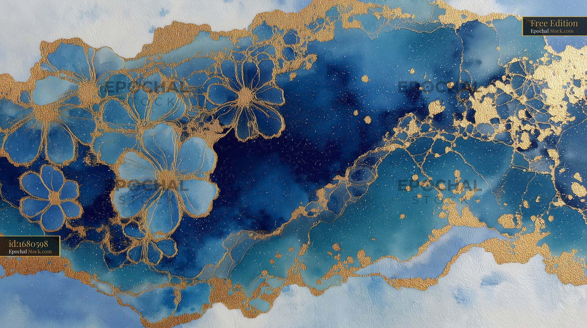 A blue background with gold floral patterns. The flowers stand out against the blue shades. The piece combines elegant shapes and rich colors.
