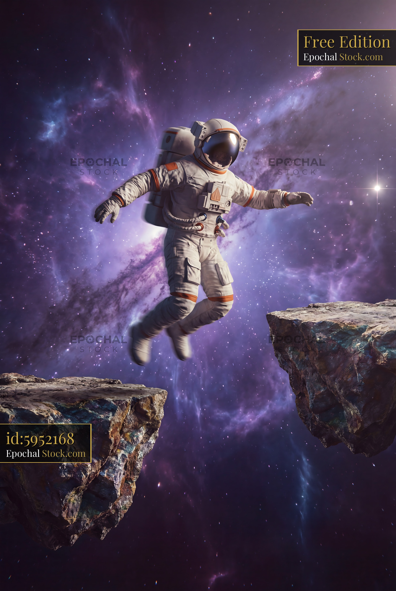An astronaut is suspended in space, moving between two rocky formations. The background shows swirling colors and stars, highlighting the vastness of the universe.