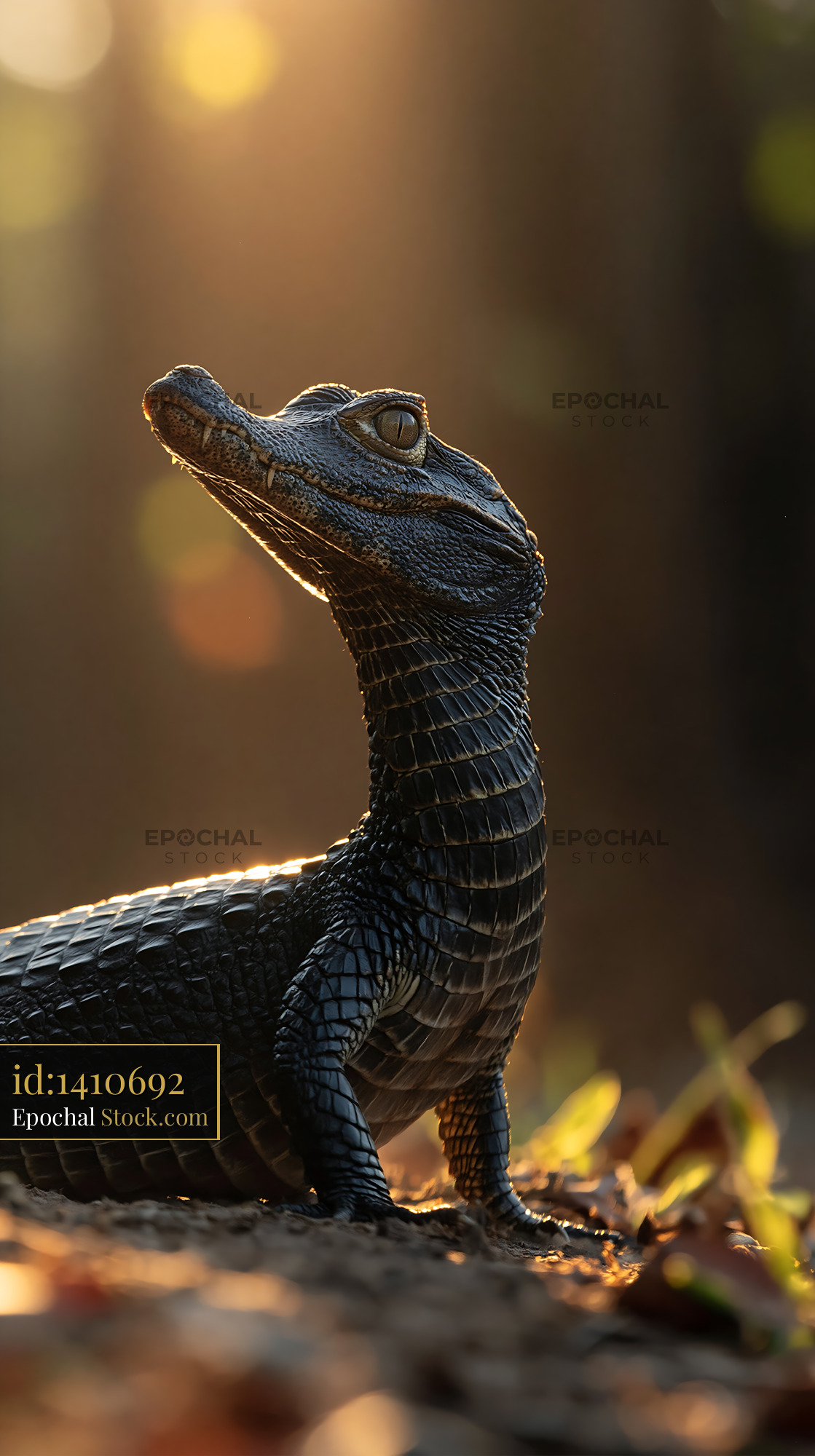 A small baby caiman gazes upwards in the warm, golden light of the forest, capturing a moment of curiosity and the fragile beauty of wildlife in its natural habitat.
