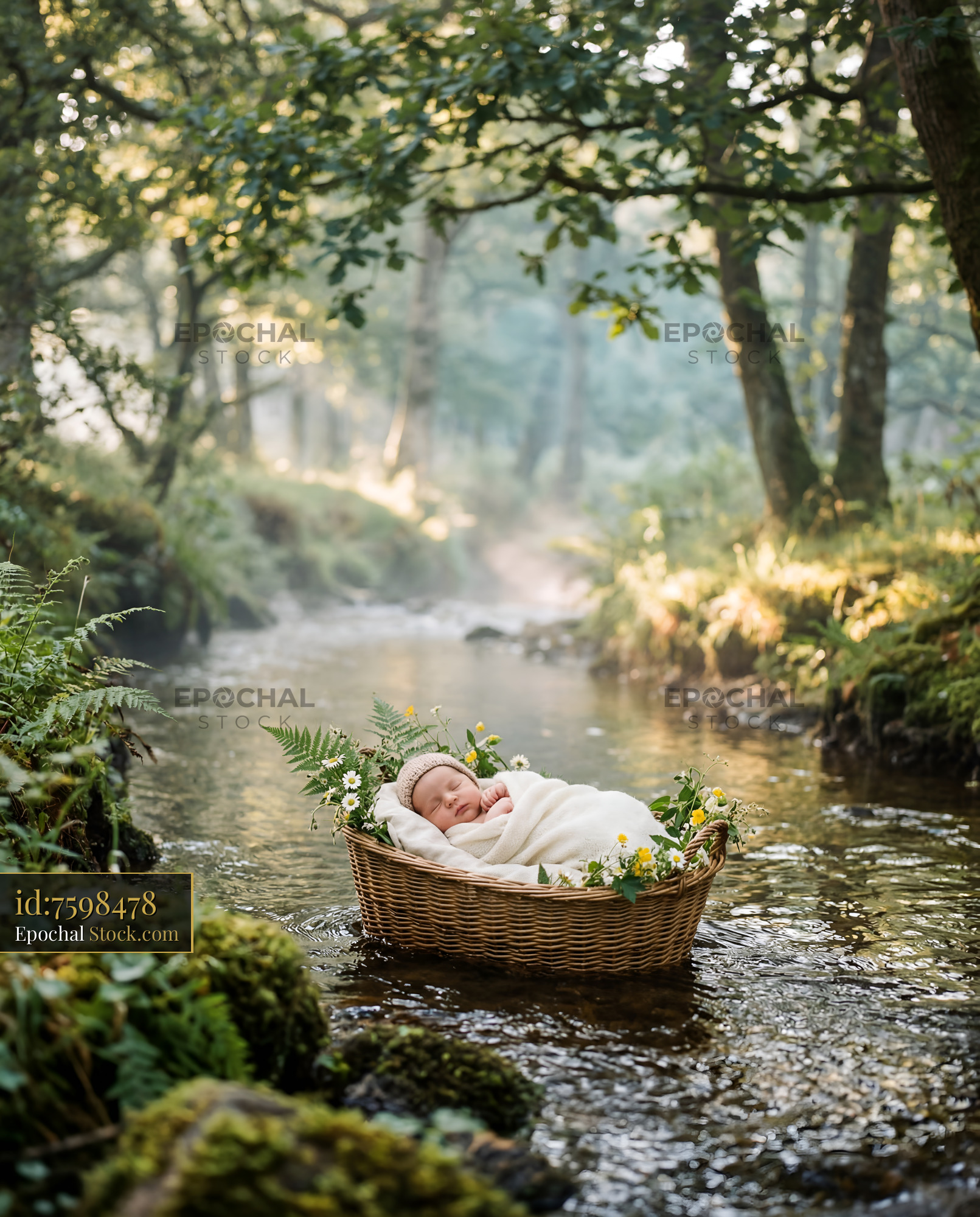 A baby is lying in a woven basket surrounded by flowers on a calm river. Trees and greenery frame the scene in soft morning light. Water flows gently nearby.