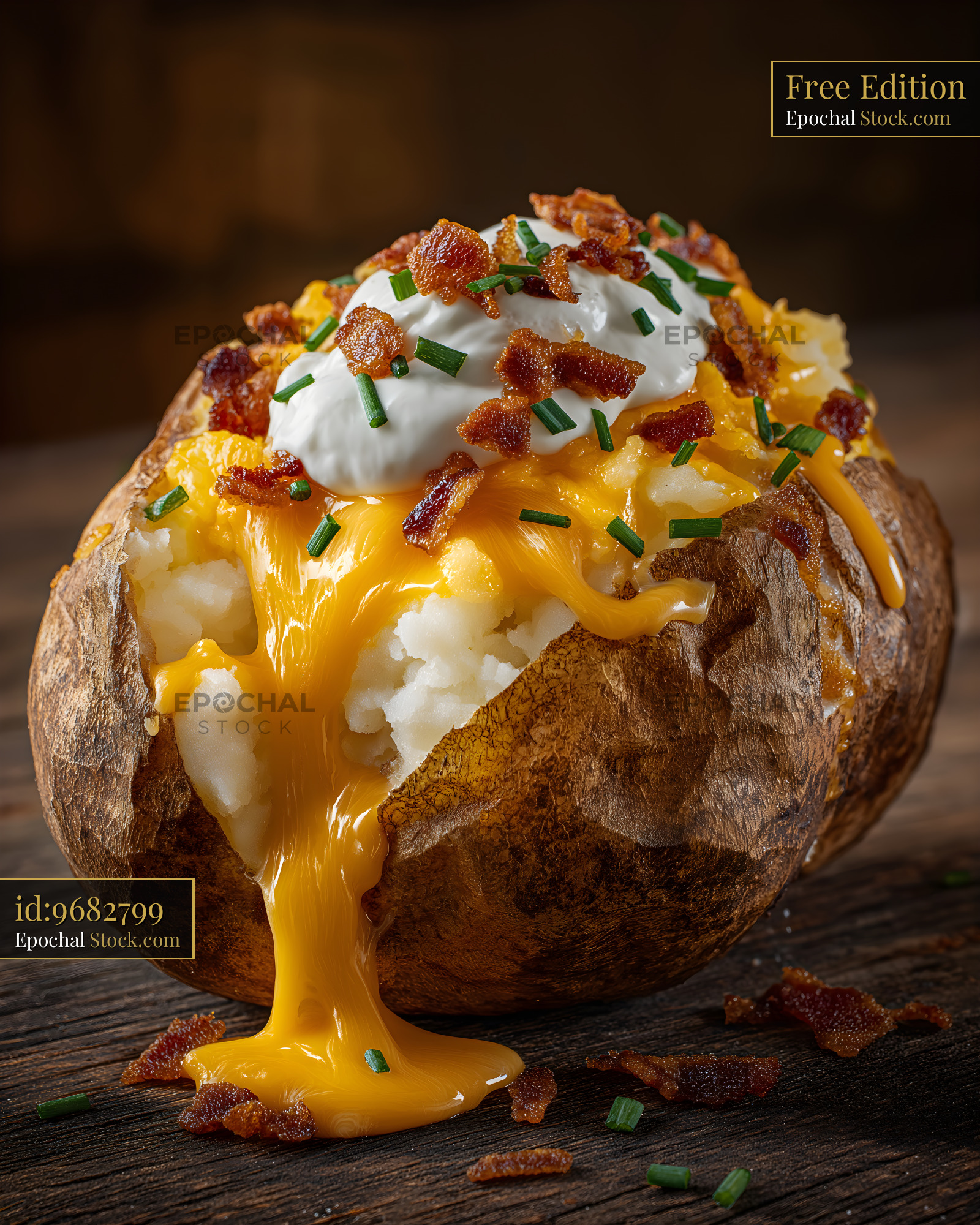 Baked potato with cheese, bacon, and sour cream toppings Free Premium Stock Image