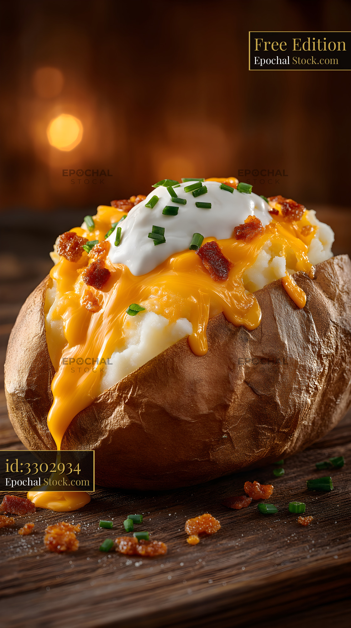A baked potato sits on a wooden table. It has melted cheese, sour cream, and bacon bits on top. Green onions are sprinkled over the dish. The background is blurred with warm light.