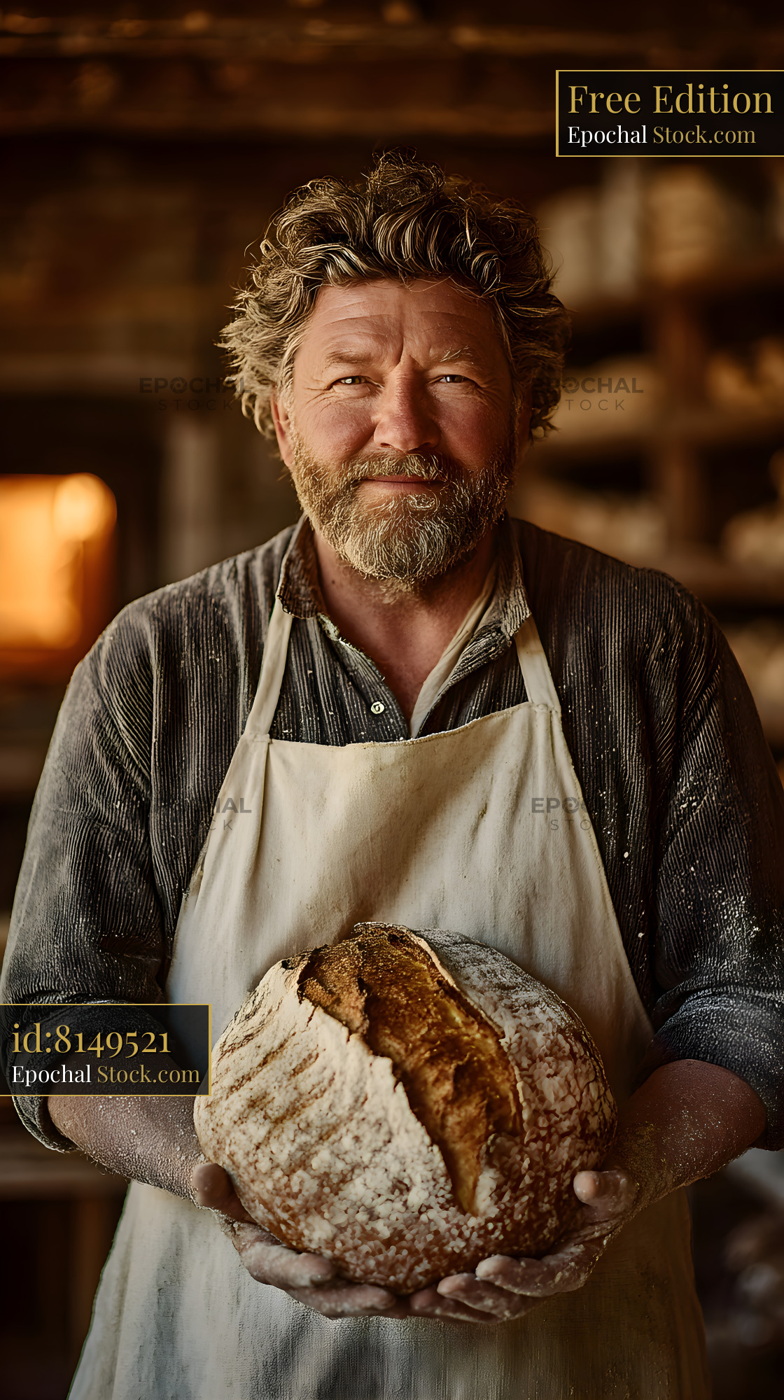 A baker stands in a village bakery holding a round loaf of bread. Flour covers his hands and apron. The warm light from the oven can be seen in the background.