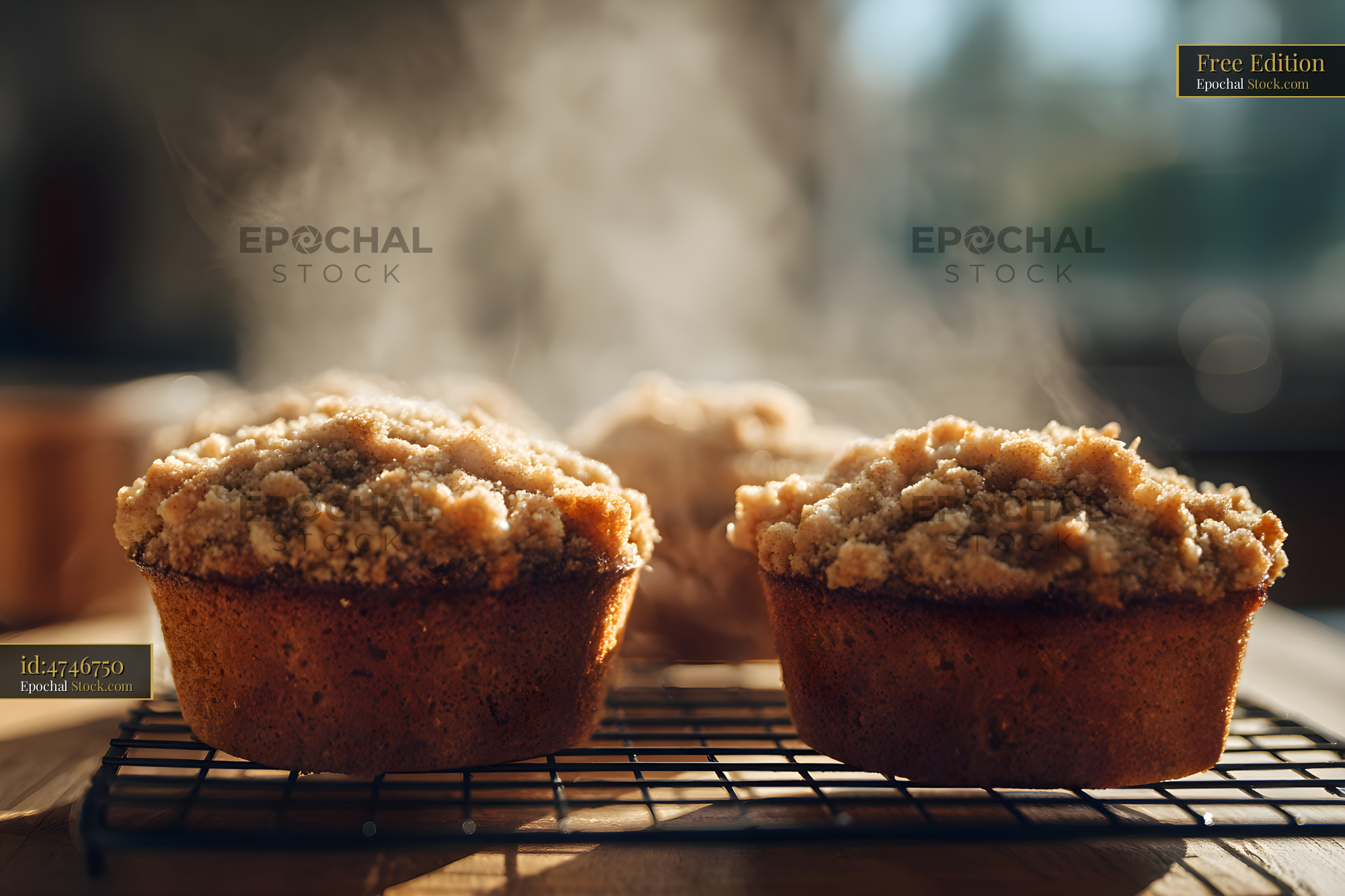 Muffins sit on a wire rack in a kitchen. Steam rises from the warm freshly baked treats. Sunlight falls on the muffins, creating a cozy atmosphere.
