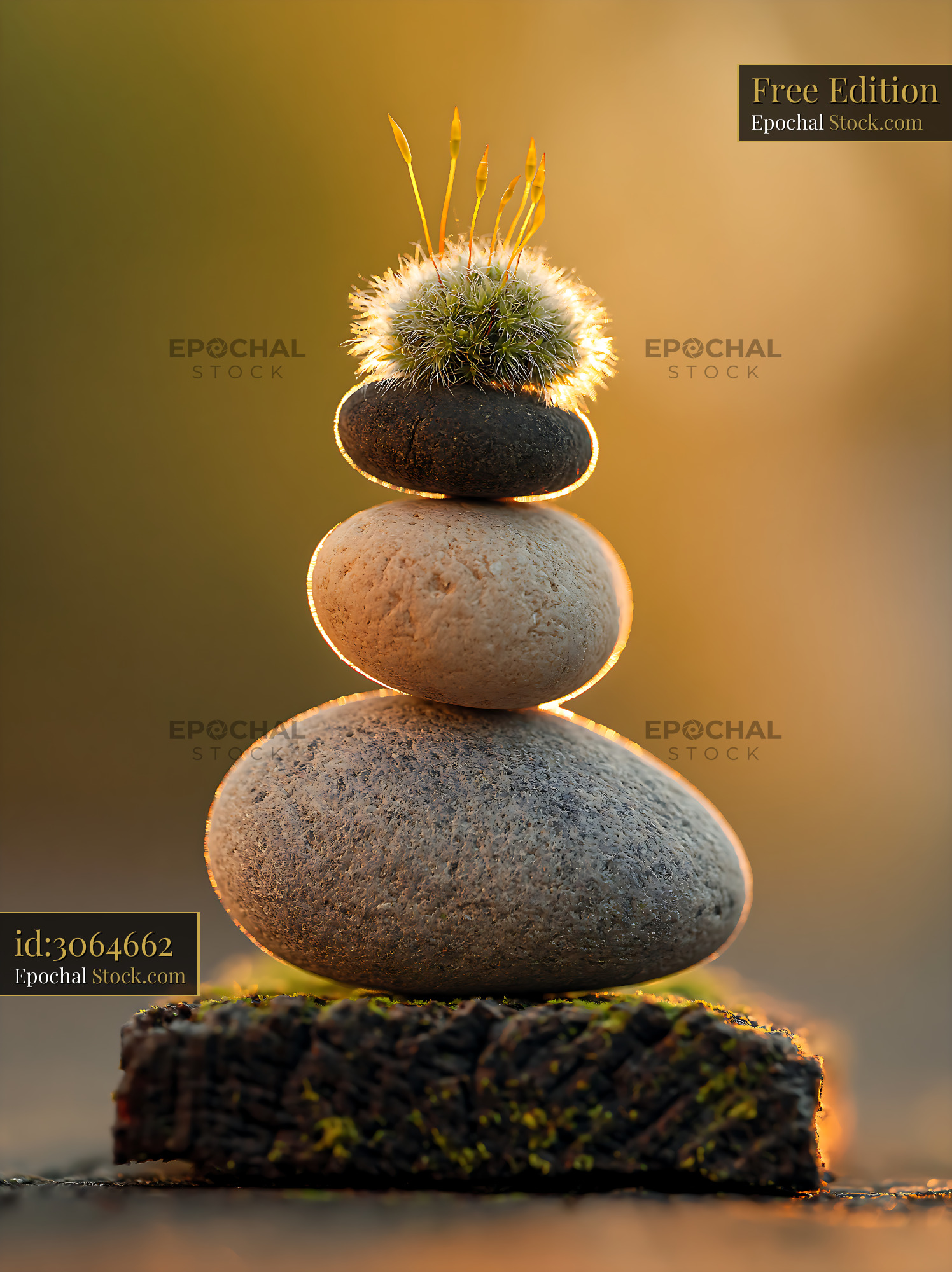 Balanced zen stones with a tiny moss plant in golden sunset light