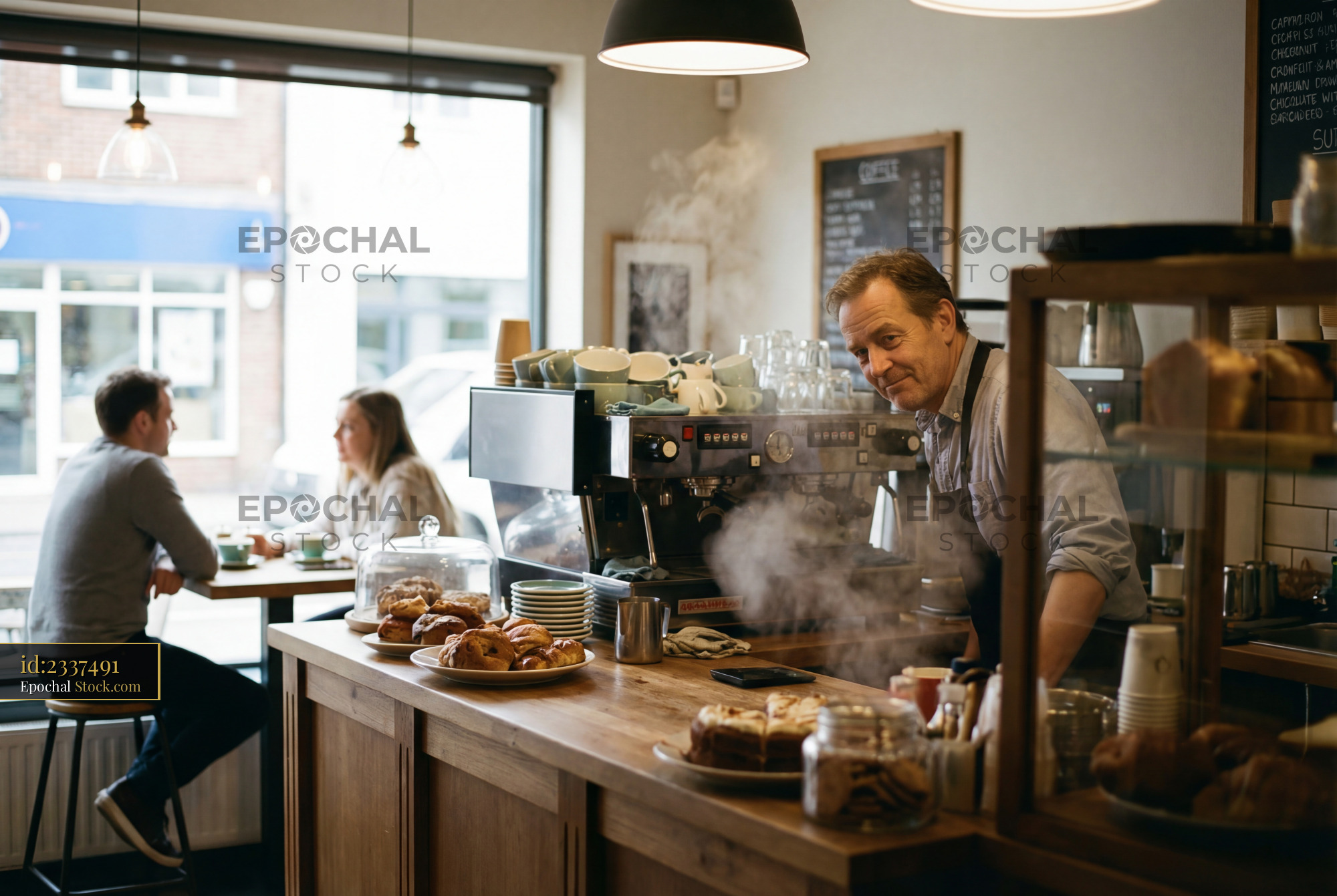 A barista prepares coffee while customers enjoy pastries and drinks. The cafe has a warm atmosphere with wooden furniture and a busy vibe. Steam fills the air from the coffee machine.