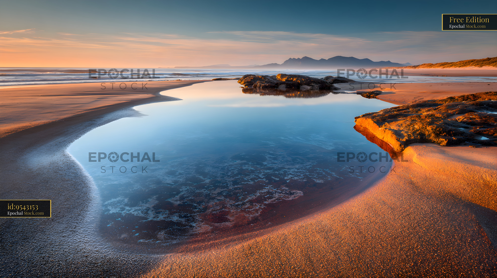 Beach scene with water pool at sunset in coastal area Free Premium Stock Image