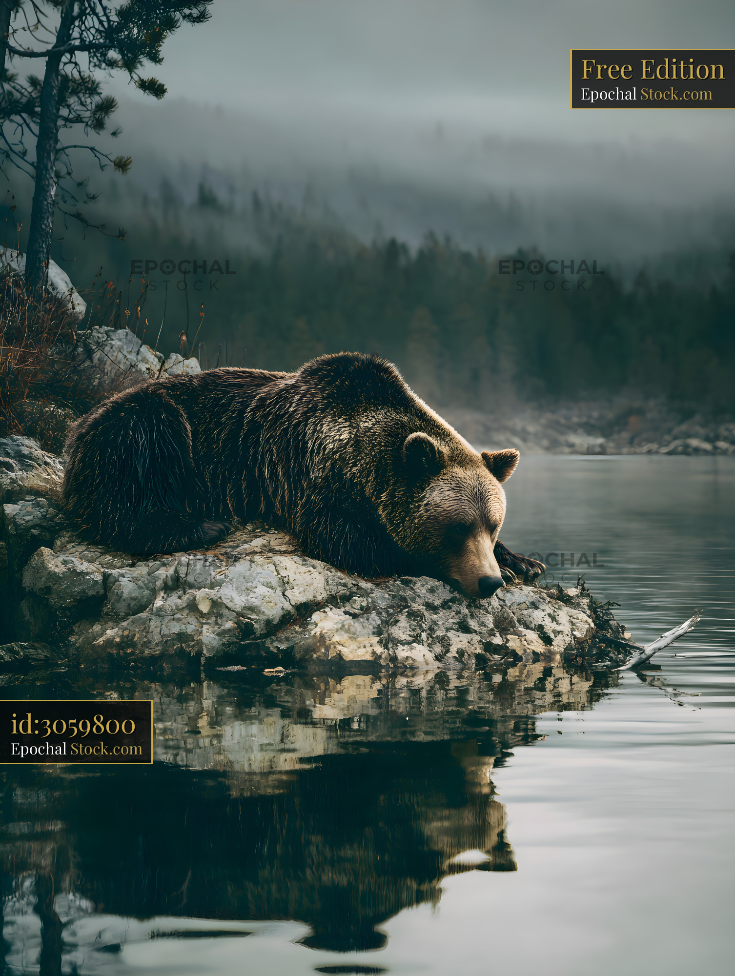 Bear resting by the water in a misty landscape Free Premium Stock Photo