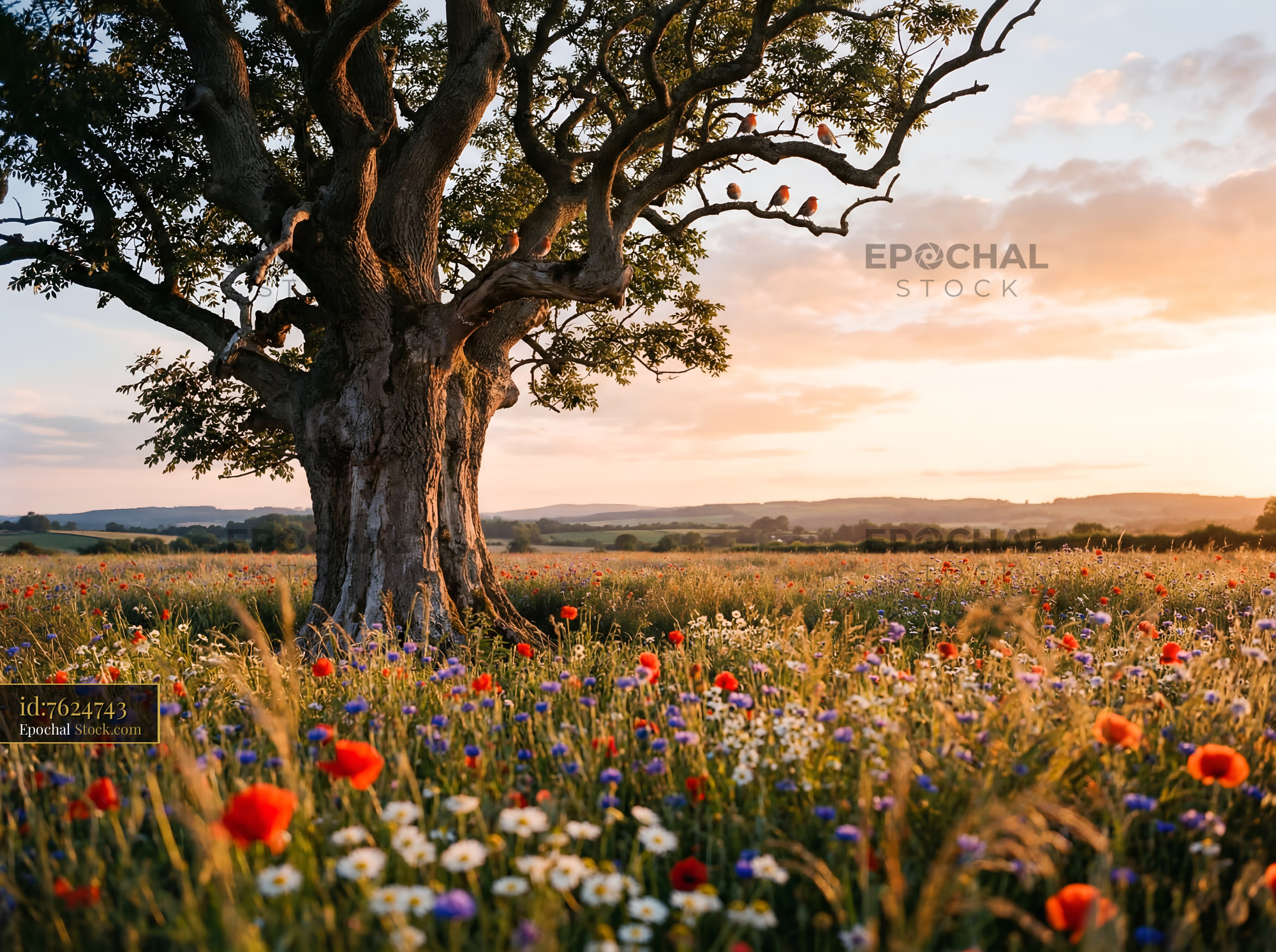 A large tree is positioned in a field filled with various flowers. The sun sets in the background, casting an orange light over the landscape. Birds can be seen in the branches.