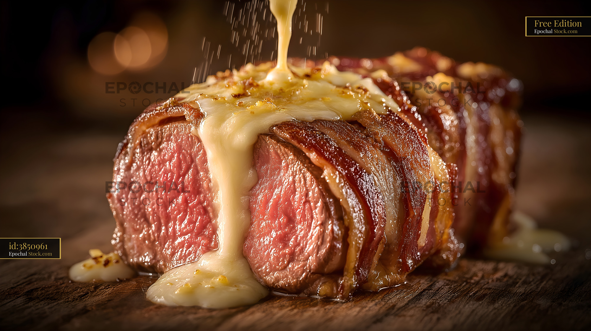 Beef wrapped in bacon with sauce pouring over it Free Premium Stock Image