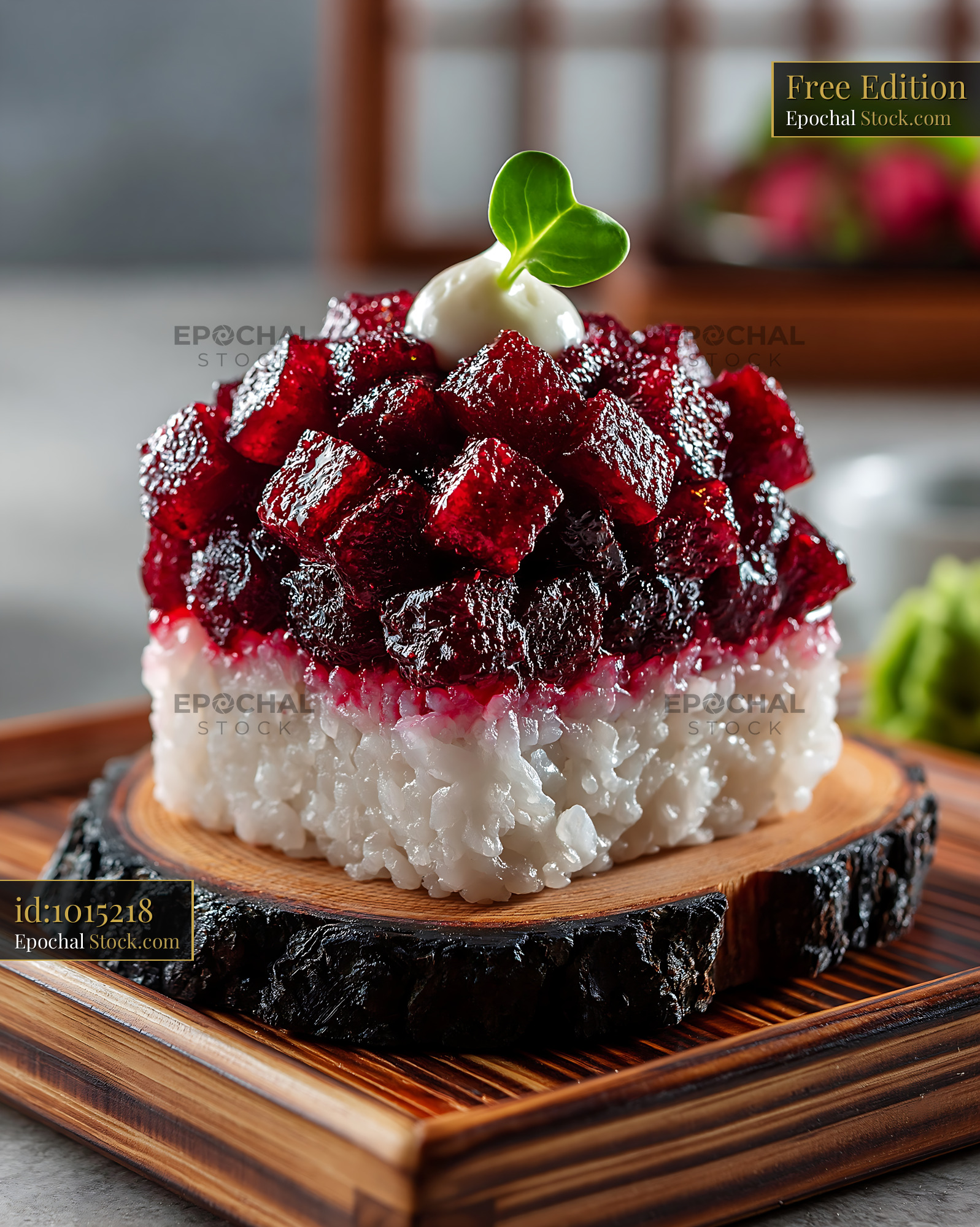 Gourmet vegan beet tartare sushi served on a rustic wood slice, blending Japanese tradition with modern plant-based fine dining for a sophisticated culinary experience.