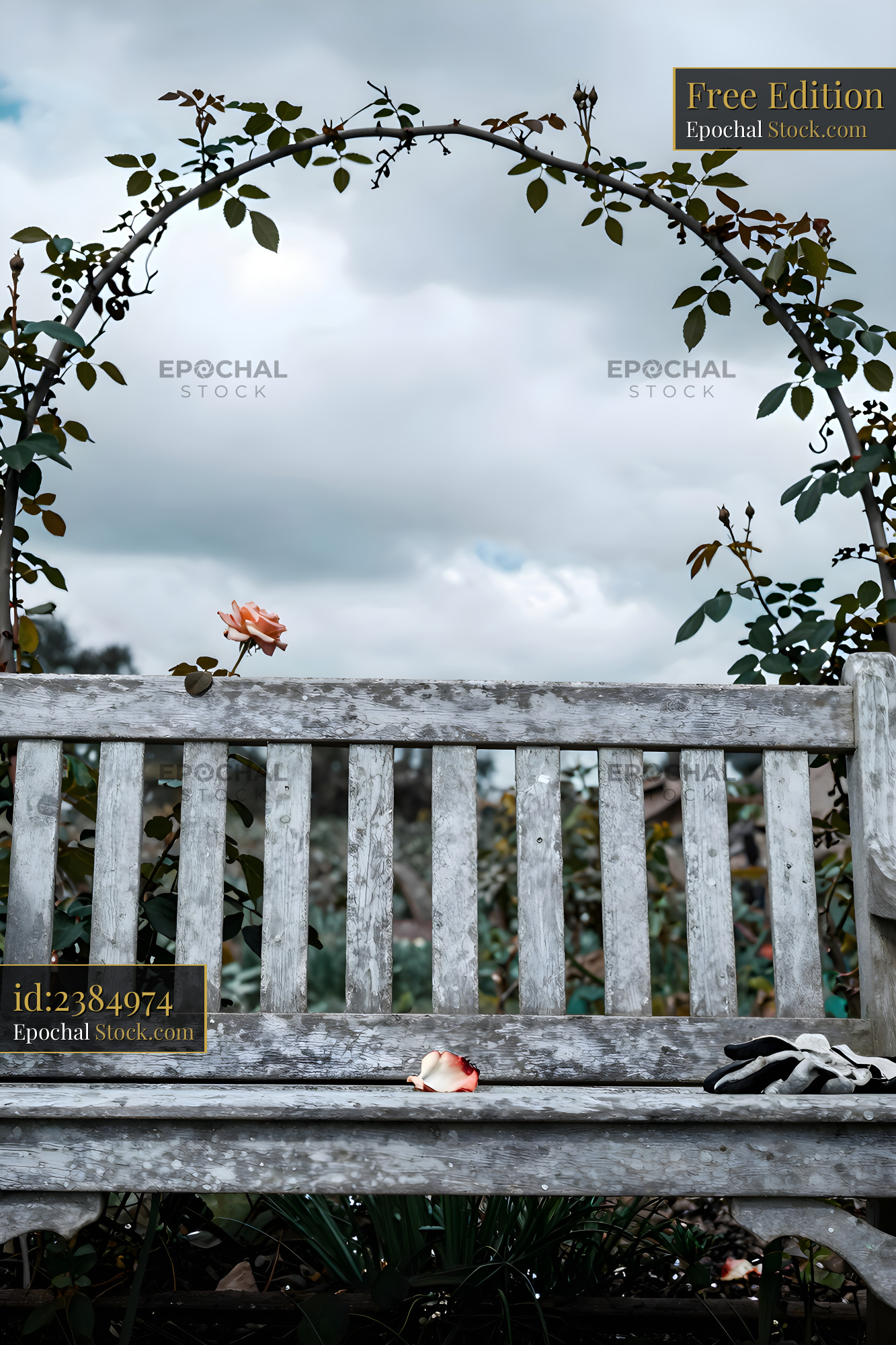 A wooden bench sits empty under an arch covered in climbing plants. A few rose petals rest on the bench. The sky is cloudy, suggesting a chance of rain in the garden.