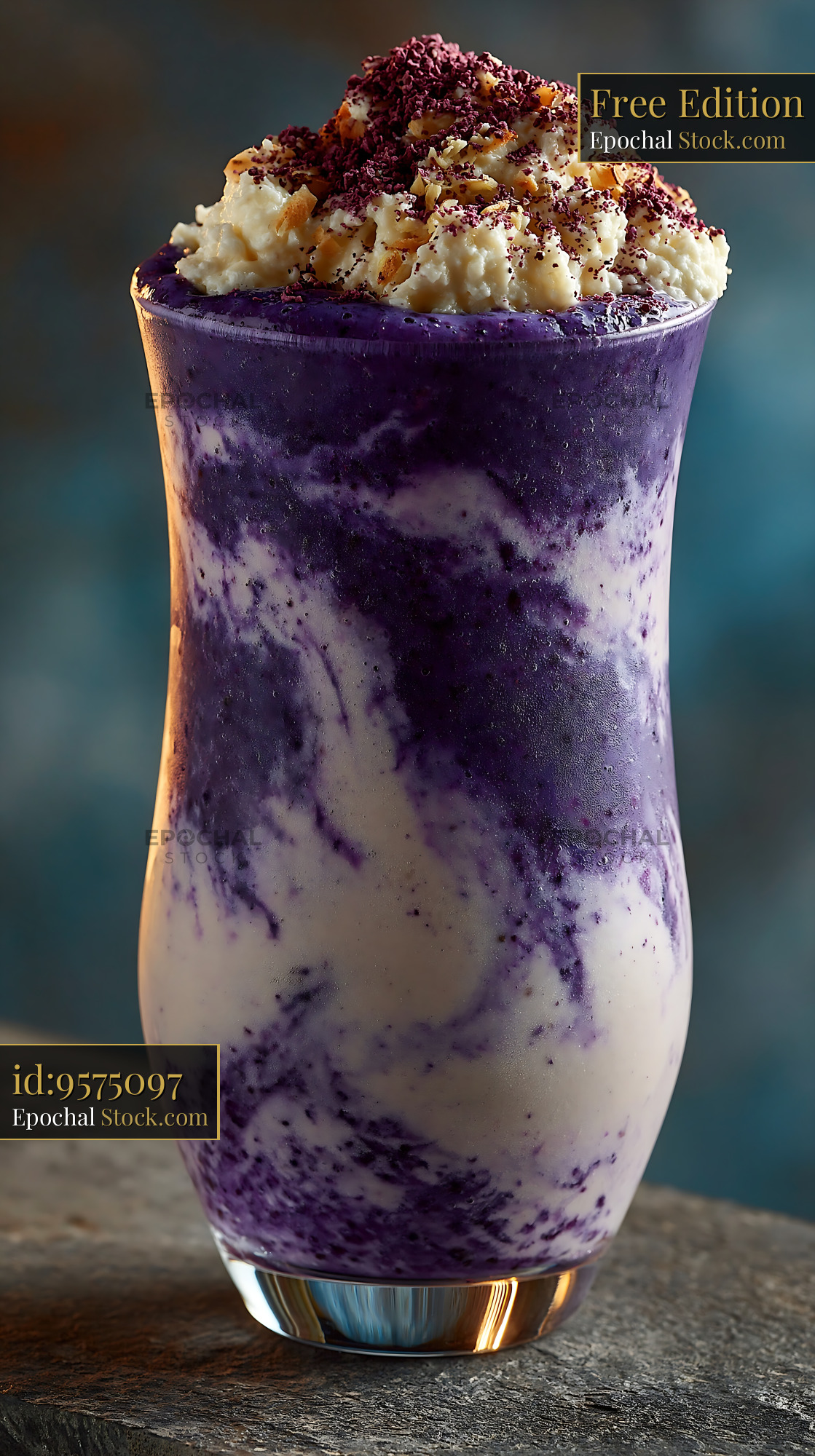 A refreshing Japanese beni imo smoothie featuring vibrant purple swirls of Okinawan sweet potato, topped with creamy foam and fine powder for a delicious healthy treat.