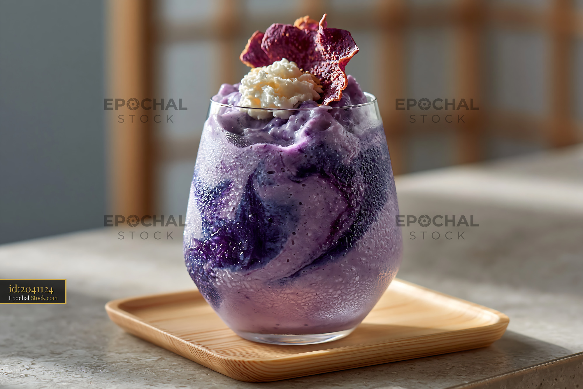 Beni imo smoothie with whipped cream and sweet potato chip garnish