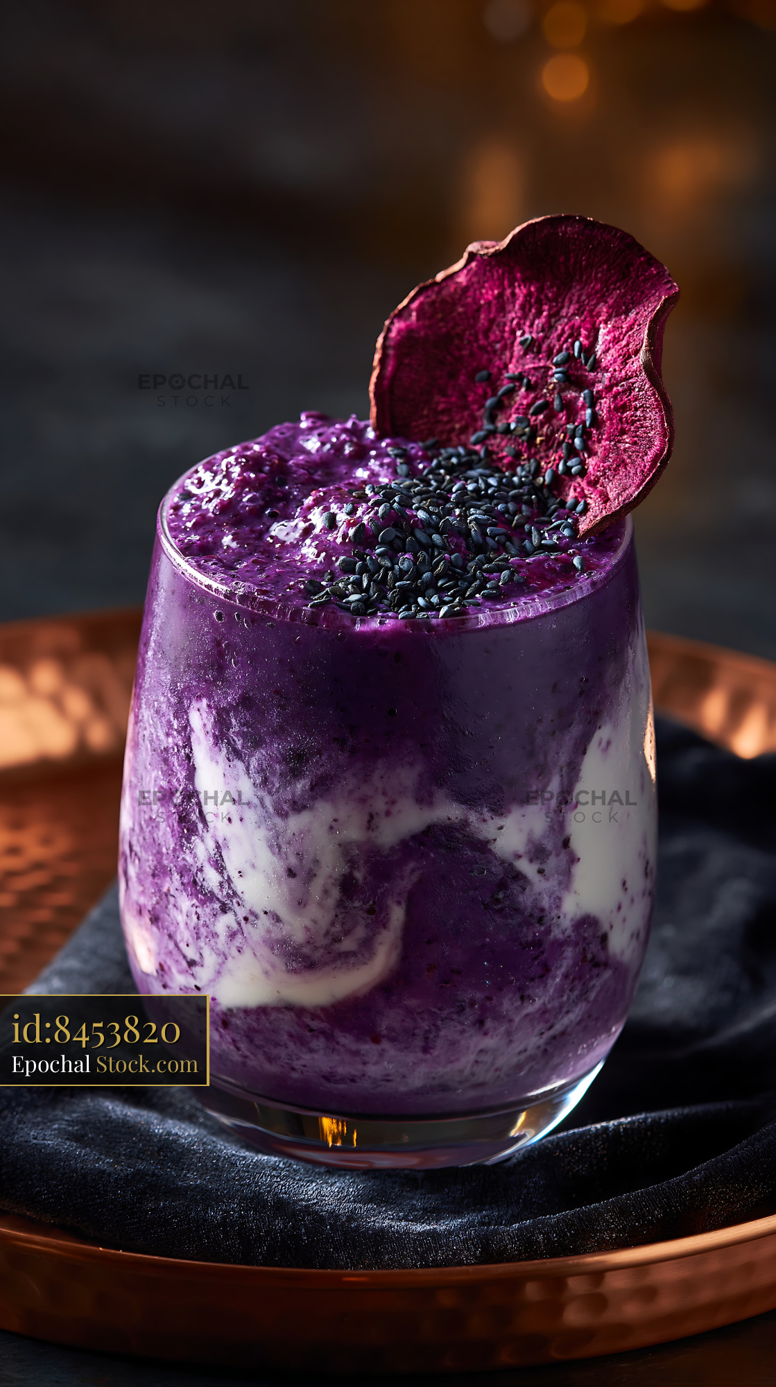 A vibrant purple sweet potato smoothie features creamy yogurt swirls and black sesame toppings. This healthy Japanese-inspired drink evokes wellness and exotic gourmet flavors.