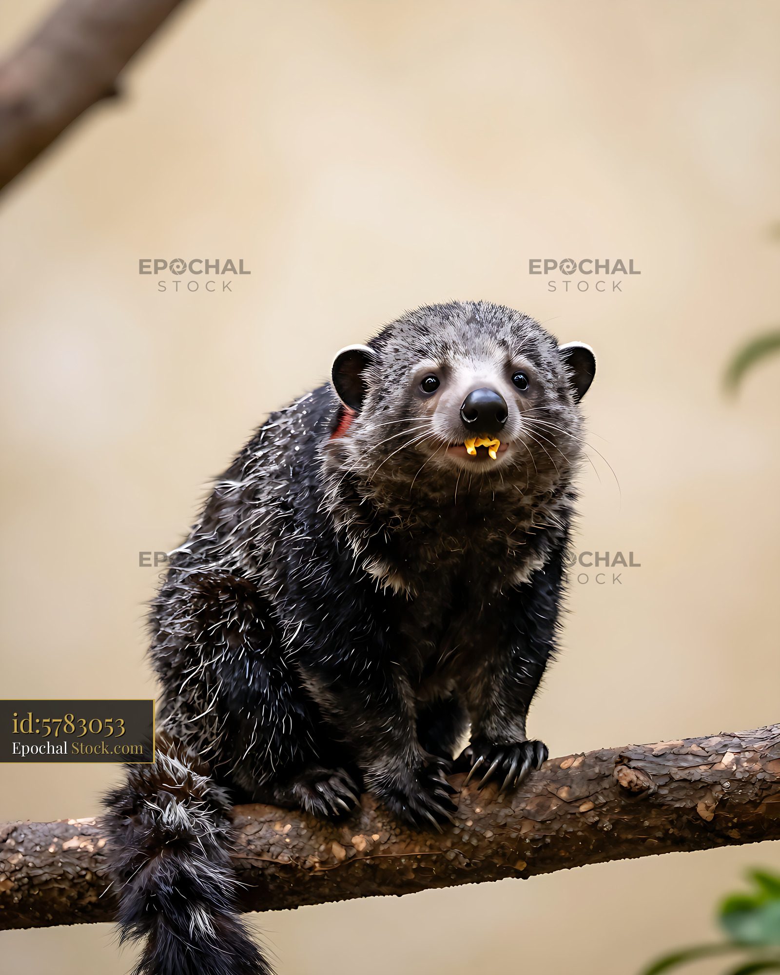 A curious binturong, also known as a bearcat, perched on a wooden branch while eating, capturing the unique charm and natural behavior of this rare Southeast Asian mammal.