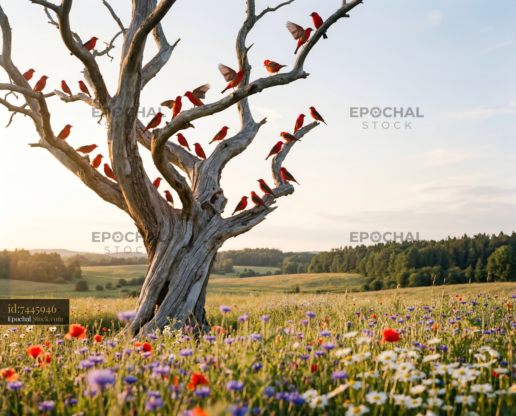 Birds gather on a dried tree in a colorful field at sunset Premium Stock Image