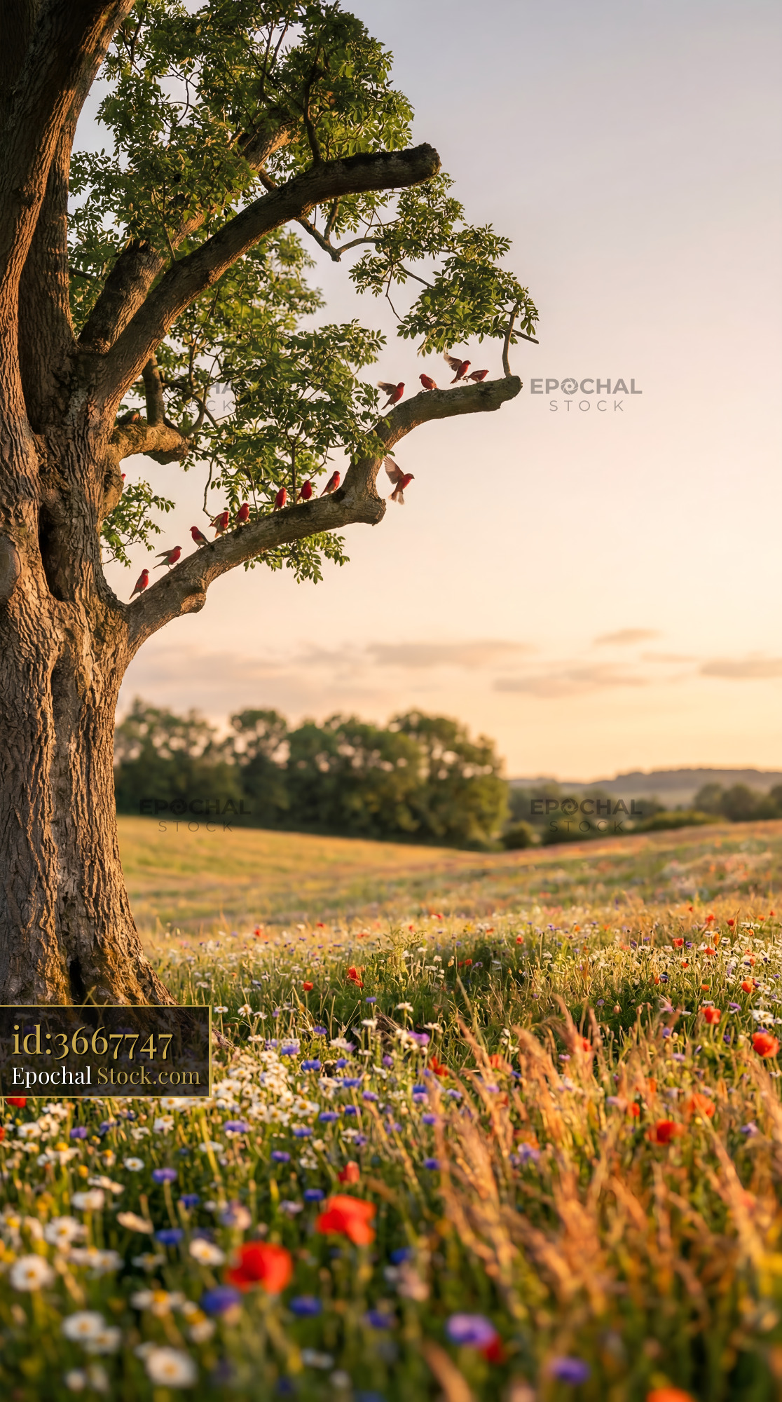 Bright flowers cover the ground below a tall tree. Birds rest on the branches as the sun sets in the background. The scene shows nature in a quiet moment during evening.
