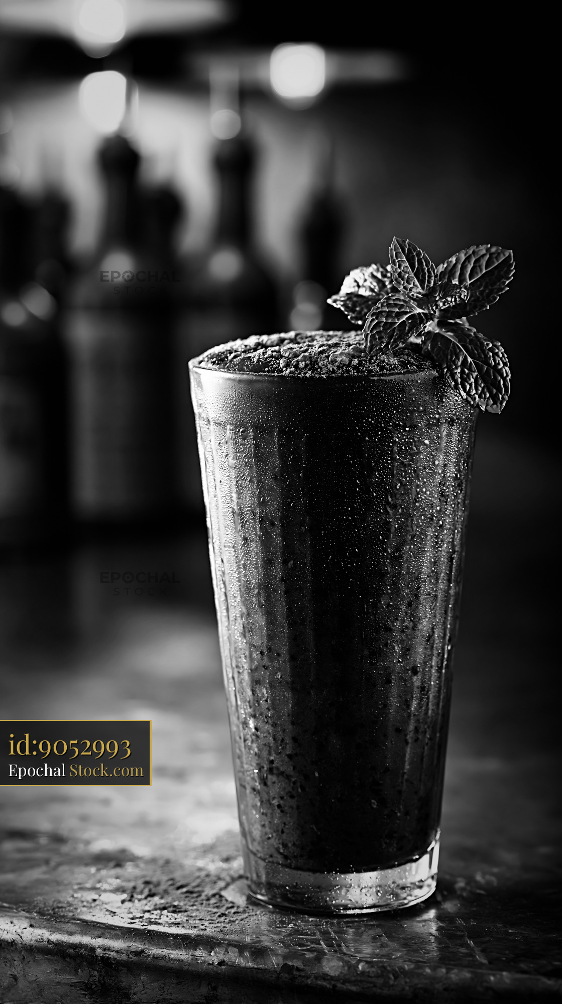 A chilled black bean smoothie served in a condensation-covered glass, garnished with fresh mint in a moody bar setting, highlighting healthy and unconventional lifestyle choices.