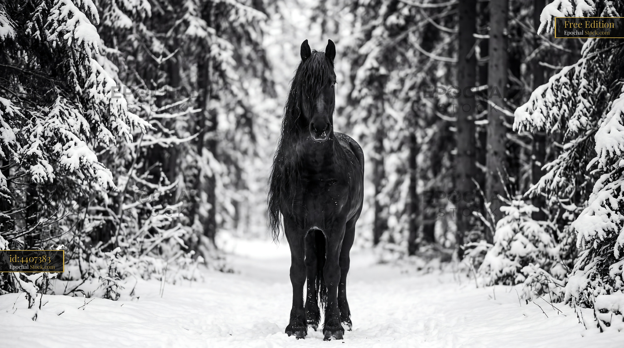 Majestic black Friesian stallion portrait set against a snowy winter forest. This monochrome equine design is ideal for statement wallpaper, dramatic home decor, and quilting projects.