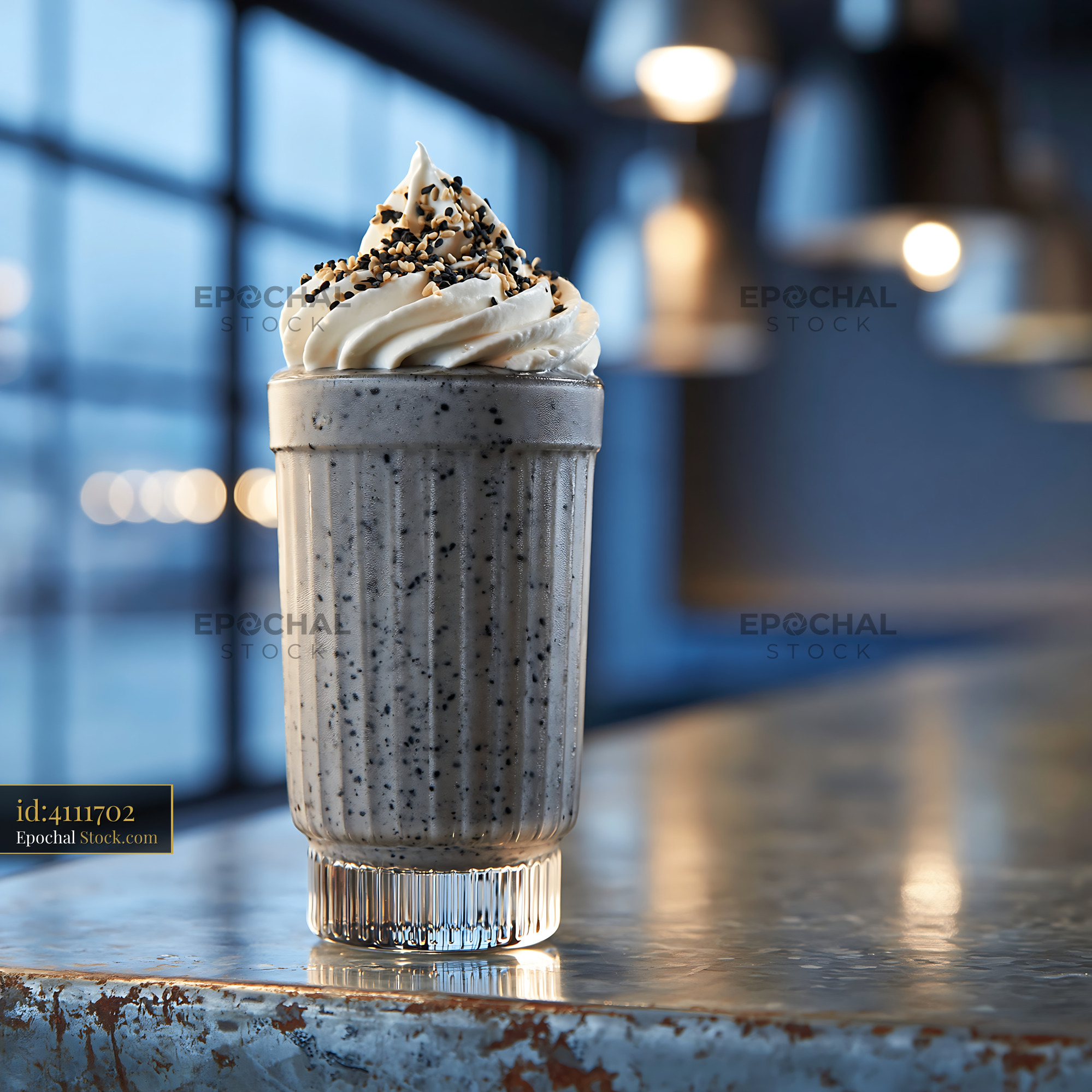 A creamy black sesame kurogoma smoothie topped with whipped cream and seeds sits on a metal counter in a modern industrial cafe, evoking a sense of urban lifestyle and healthy indulgence.