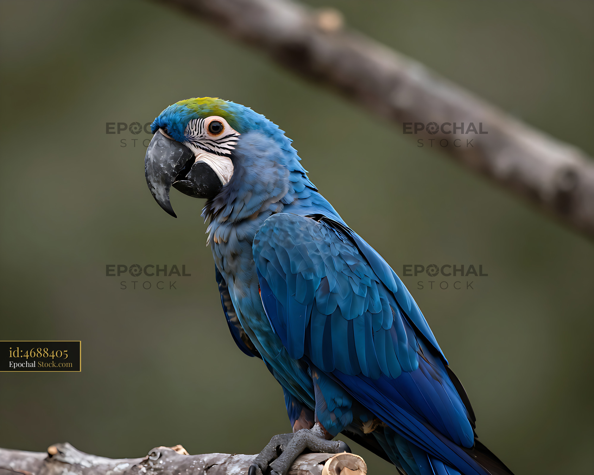 A majestic blue hyacinth macaw rests on a branch, its vivid plumage and thoughtful expression evoking themes of wildlife conservation and the silent beauty of the rainforest.