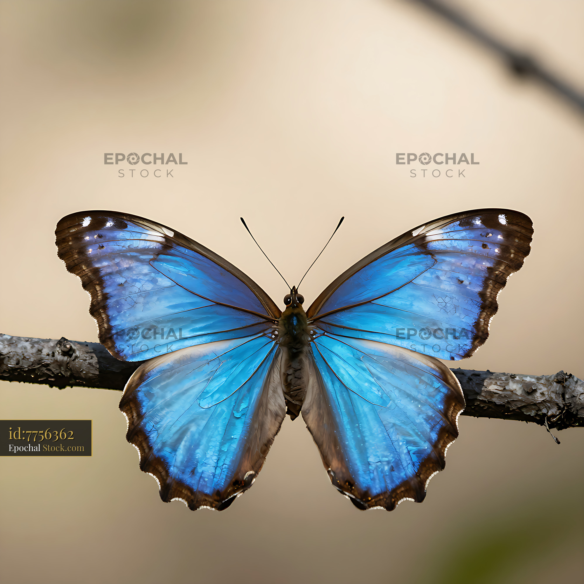 A stunning blue morpho butterfly displays its iridescent wings while perched on a rustic branch, symbolizing transformation, delicate beauty, and the serenity of nature.