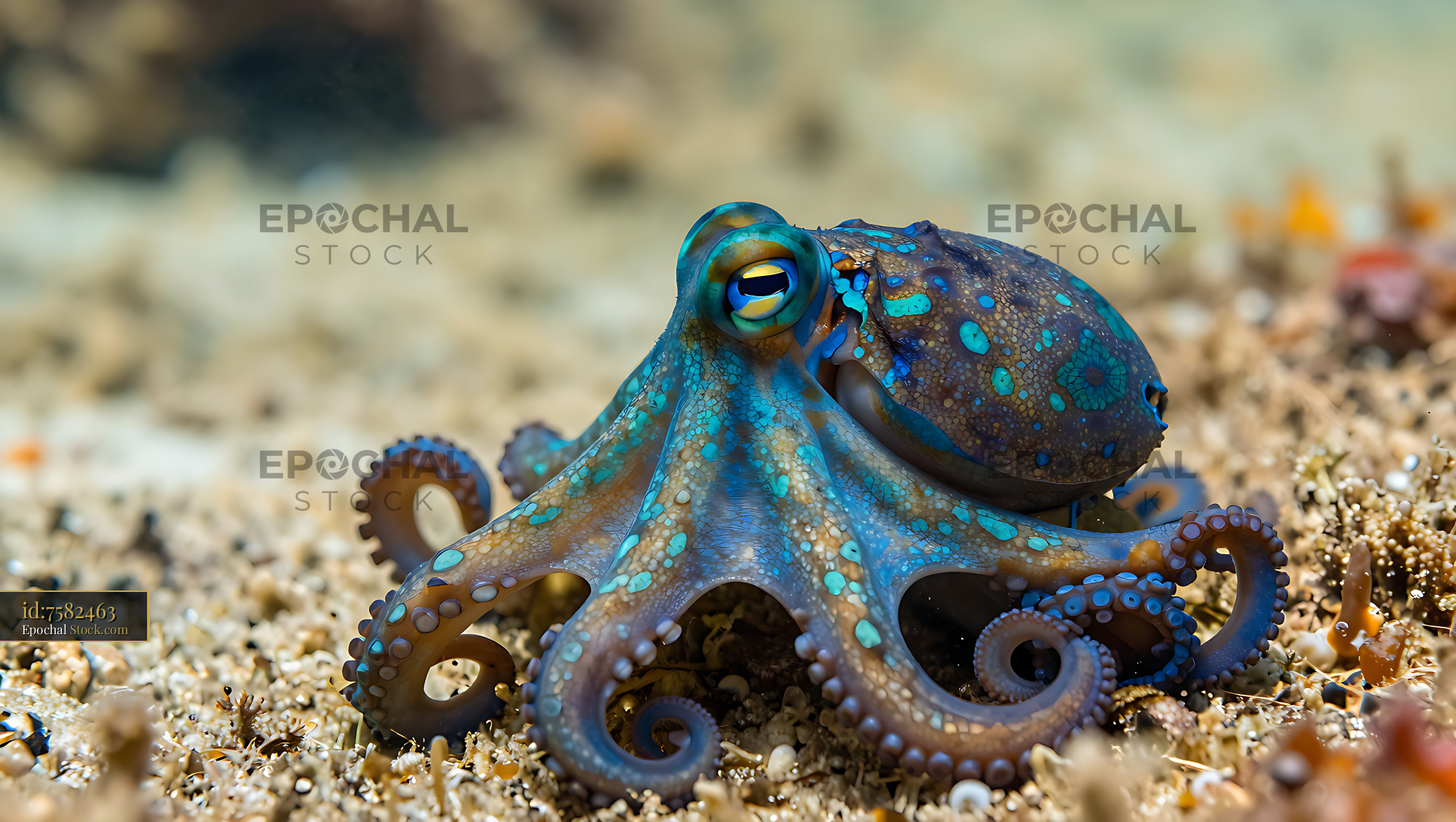 A vibrant blue-ringed octopus displays its warning colors while resting on a sandy seabed, representing the fascinating yet dangerous beauty of marine wildlife.