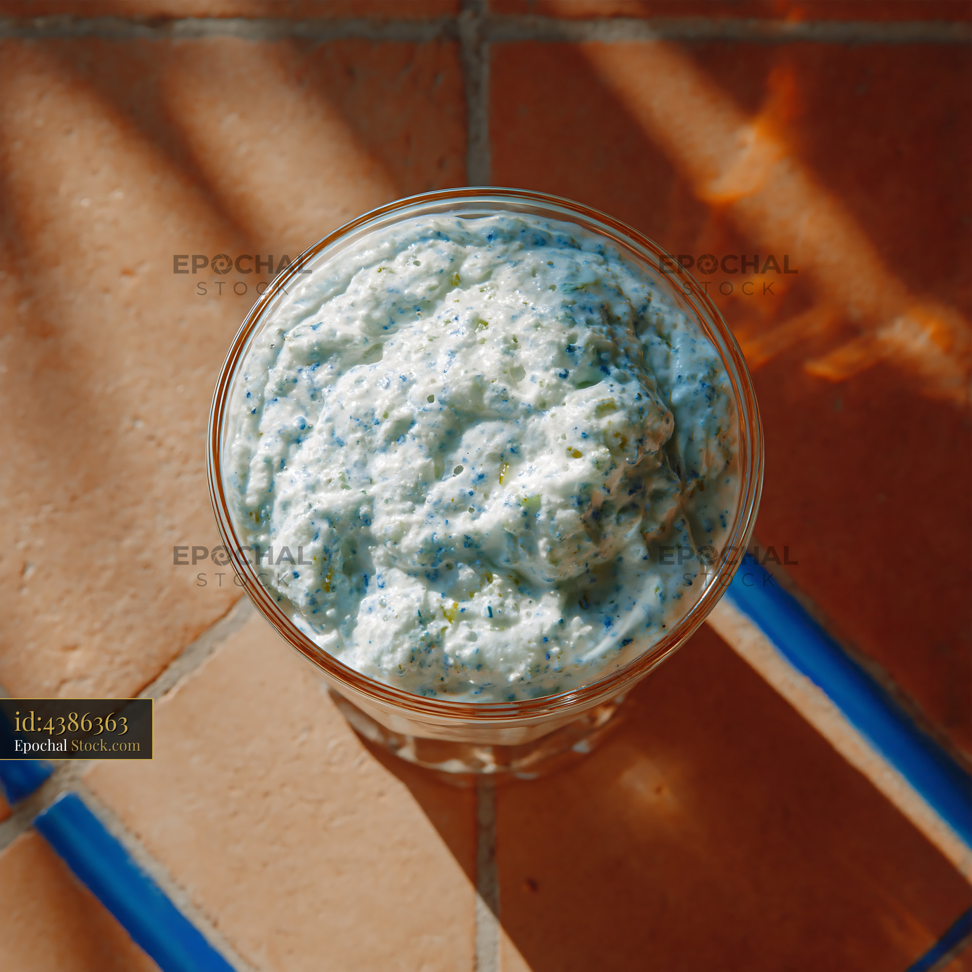 A refreshing blue spirulina milkshake served in a glass, placed on a rustic terracotta tiled floor under warm sunlight, evoking a sense of healthy lifestyle, natural nutrition, and summer freshness.