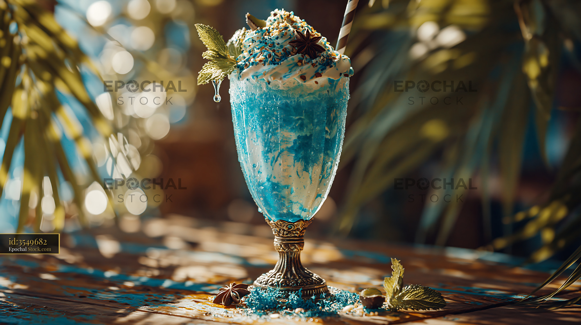 A vibrant blue spirulina milkshake served in an ornate glass with whipped cream and spices, evoking a refreshing tropical summer mood at a sunny outdoor setting.