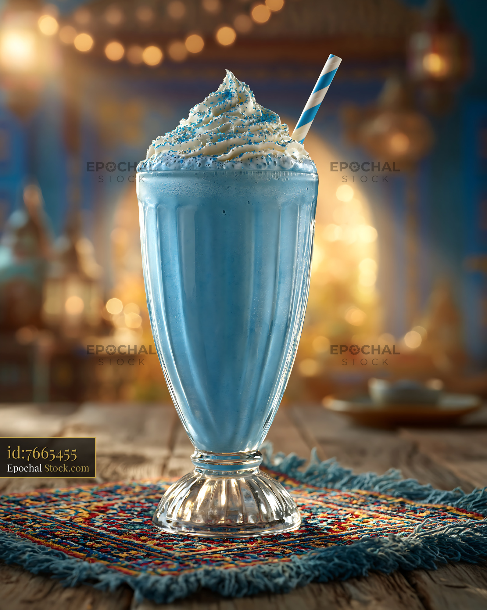 A refreshing blue spirulina milkshake topped with whipped cream and blue sprinkles, served on an ornate rug with a warm, festive bokeh background, evoking a sense of exotic culinary indulgence.