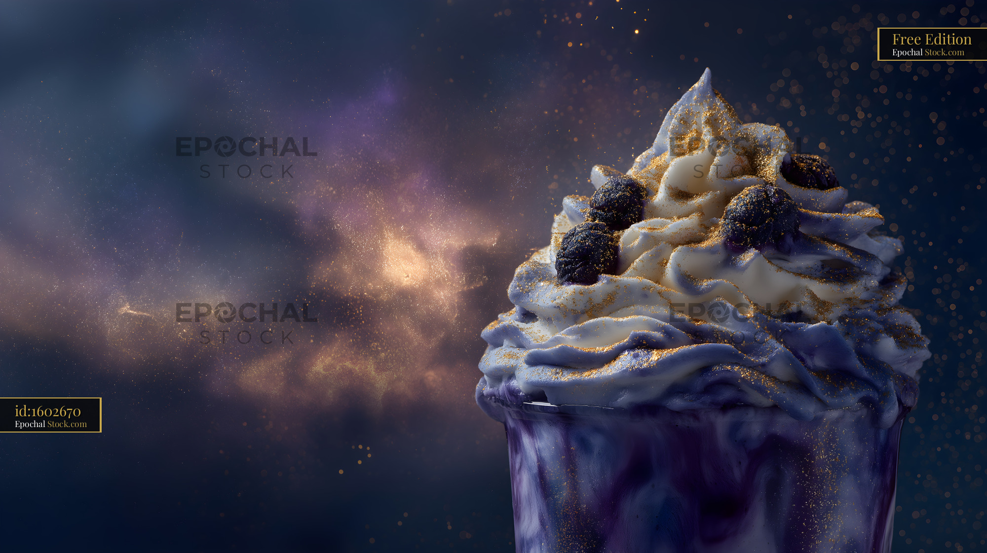 A tall glass holds a dessert with blueberry flavor. Cream is whipped on top and dark berries are placed along with sparkles around. The setting hints at a nighttime scene with swirling colors.