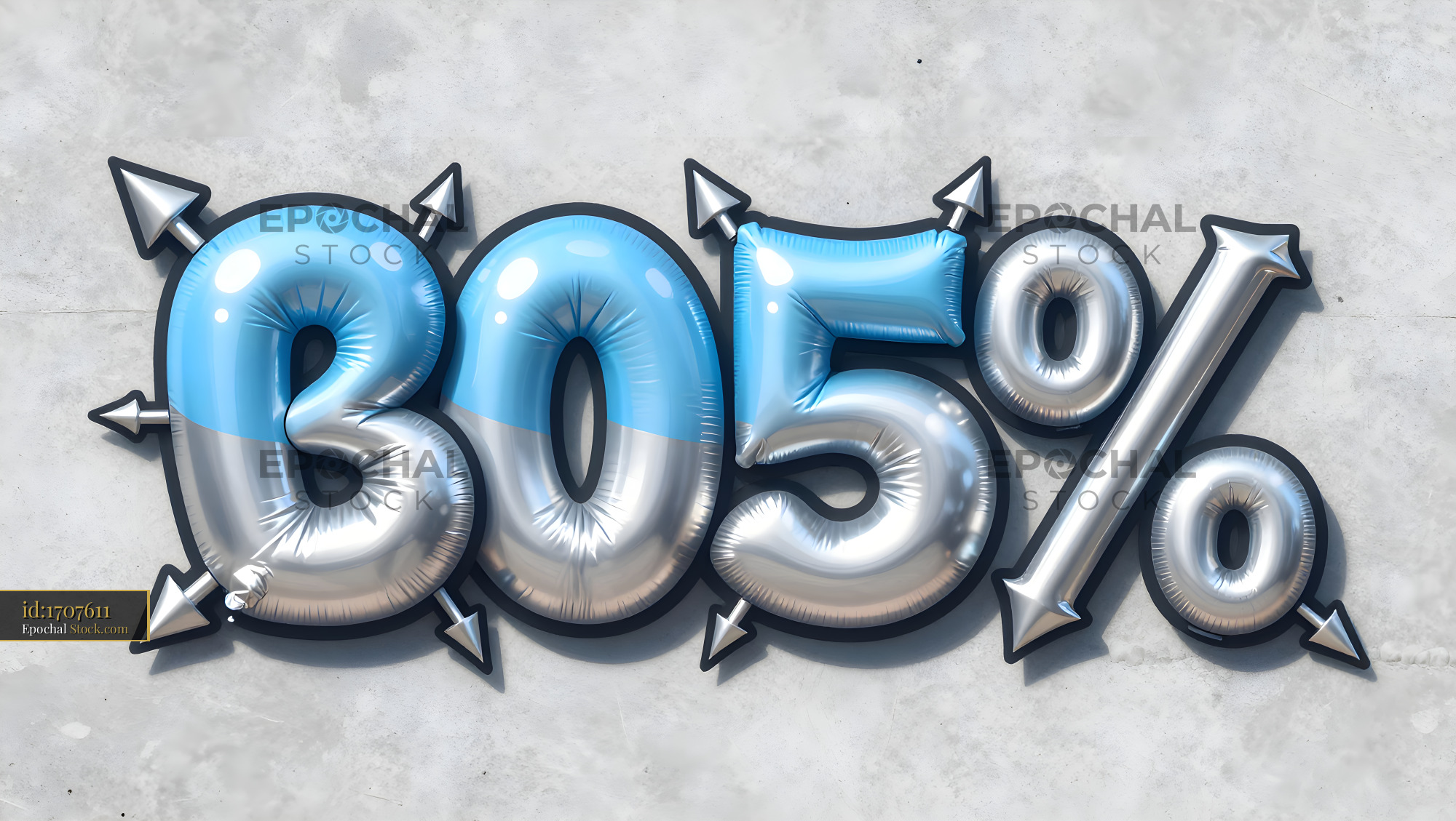 Bright balloons in the shape of numbers and arrows are attached to a gray wall. The display shows a percentage with a playful design, capturing attention easily.