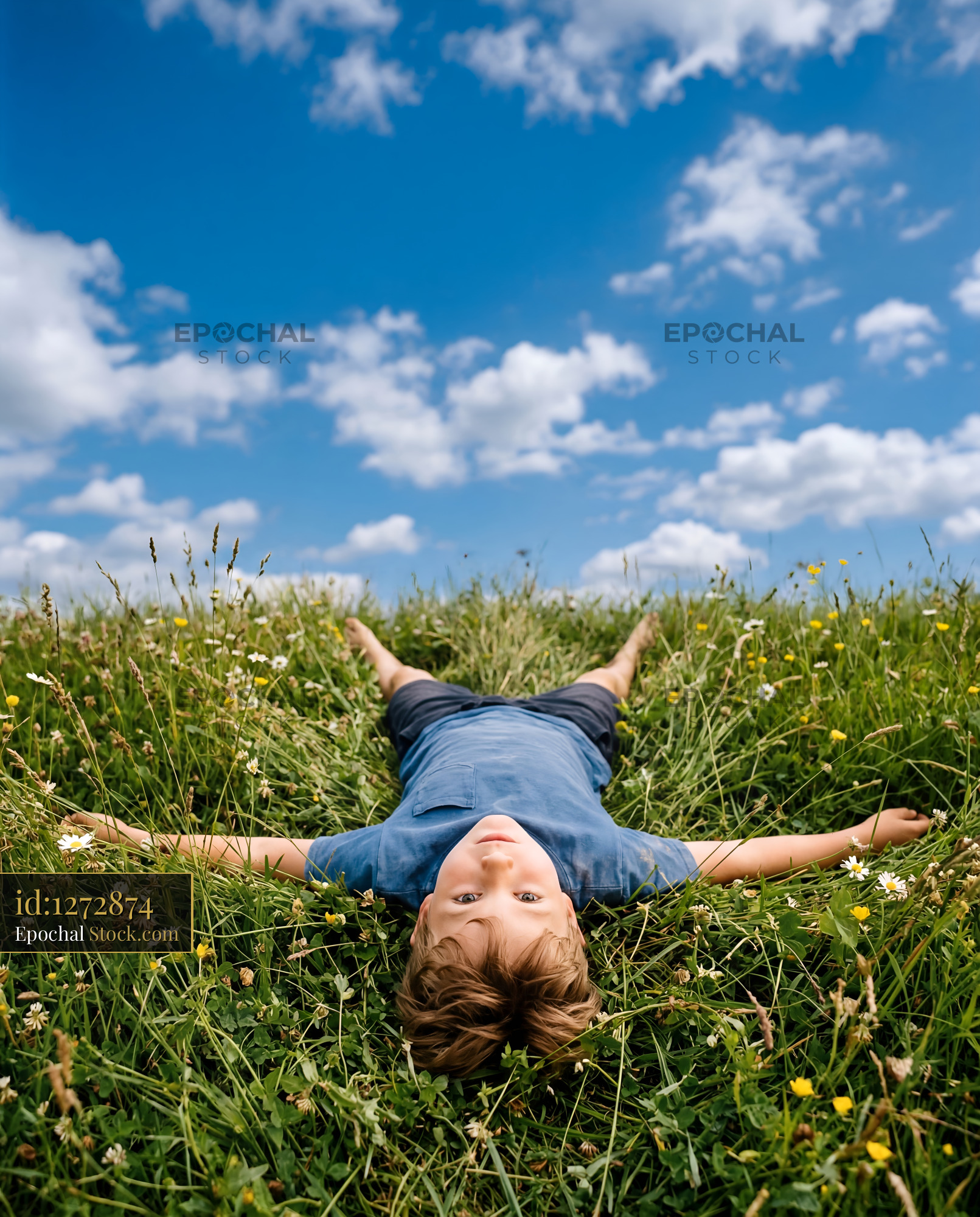 A boy lies on his back in a grassy area with flowers. He looks up at the sky which has blue colors and white clouds. It is a sunny day with green grass around him.