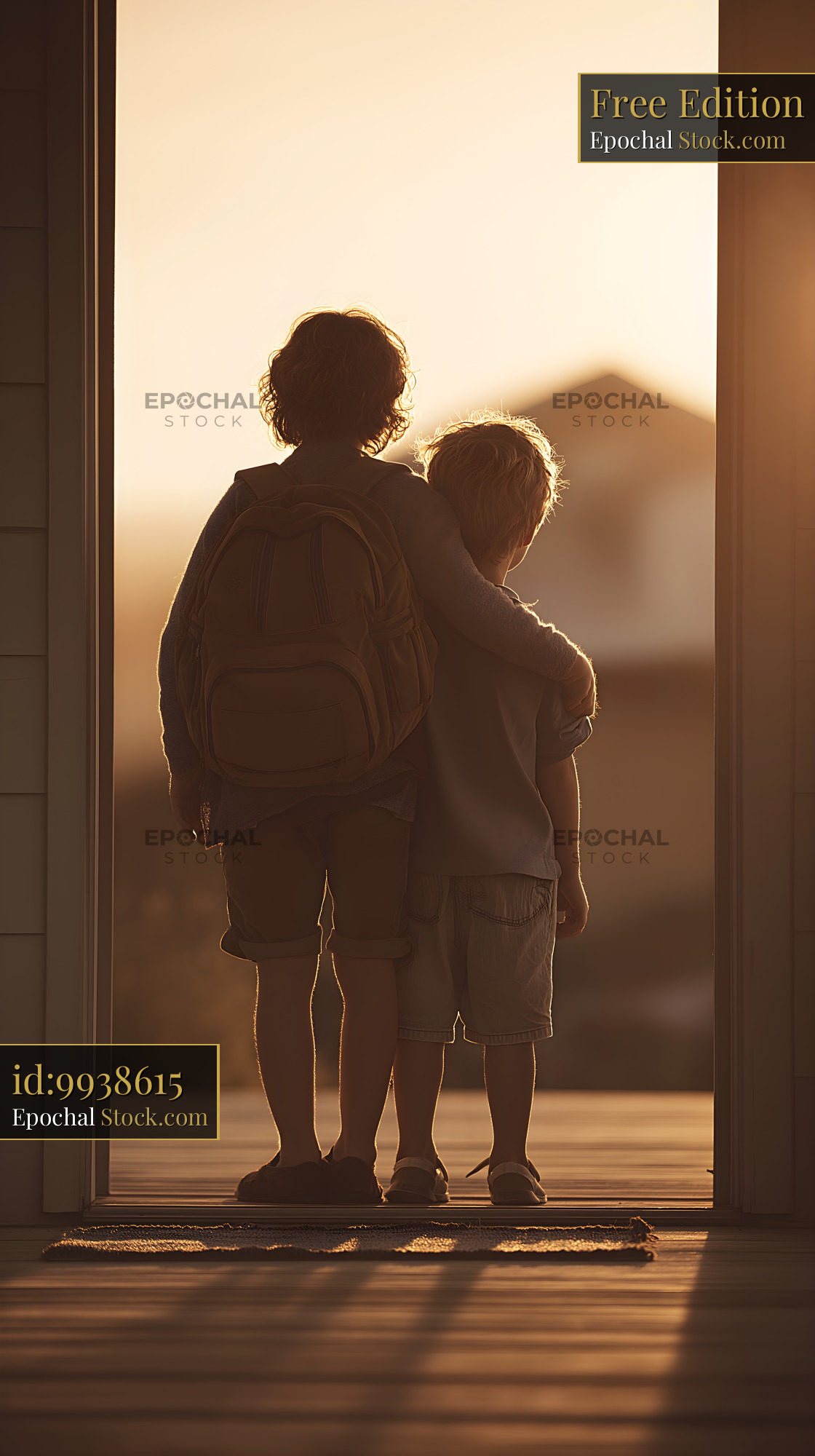 Two boys stand close together at a doorway during sunset. They look outside while one boy has his arm around the other. The sun creates a warm glow around them.