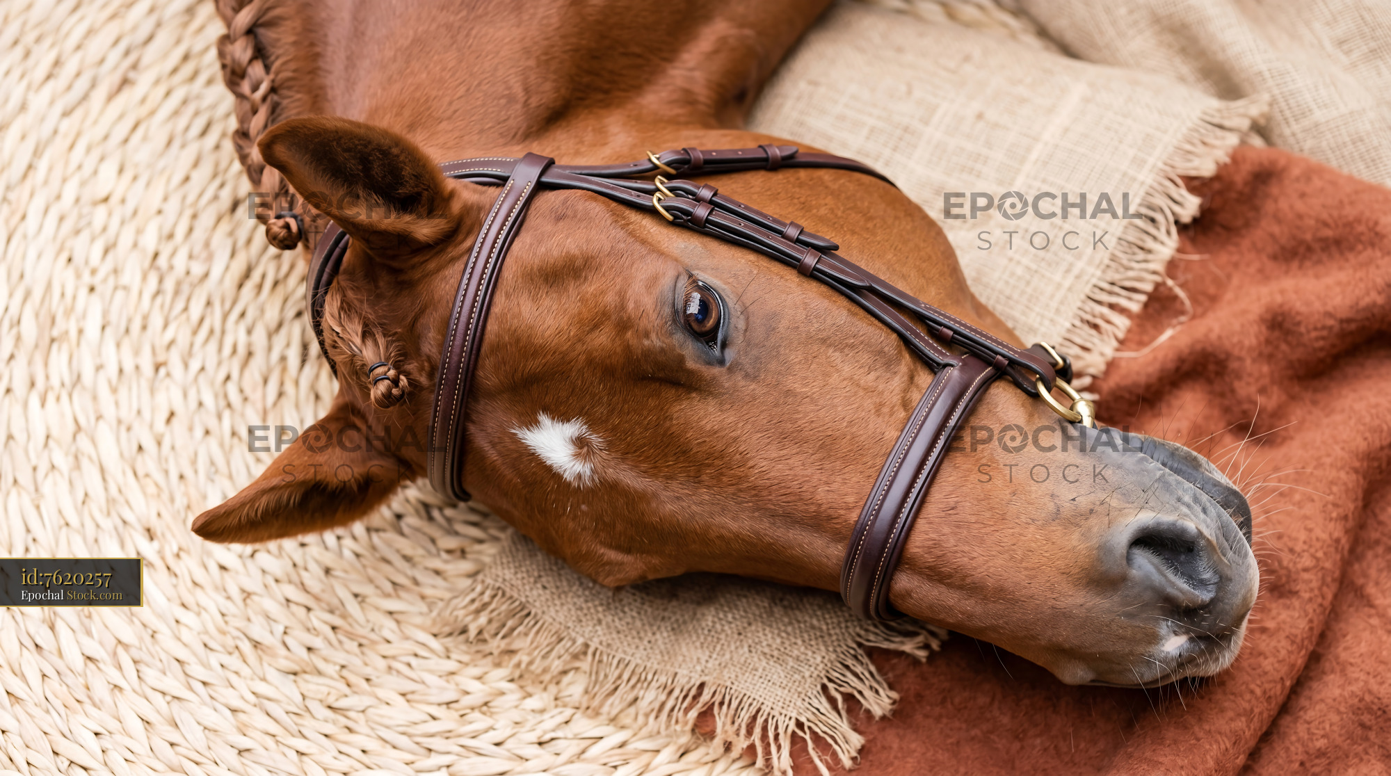 Realistic equestrian flat lay featuring a chestnut horse with braids. Ideal for rustic home decor, quilting cotton, gift wrap, and nursery wallpaper.
