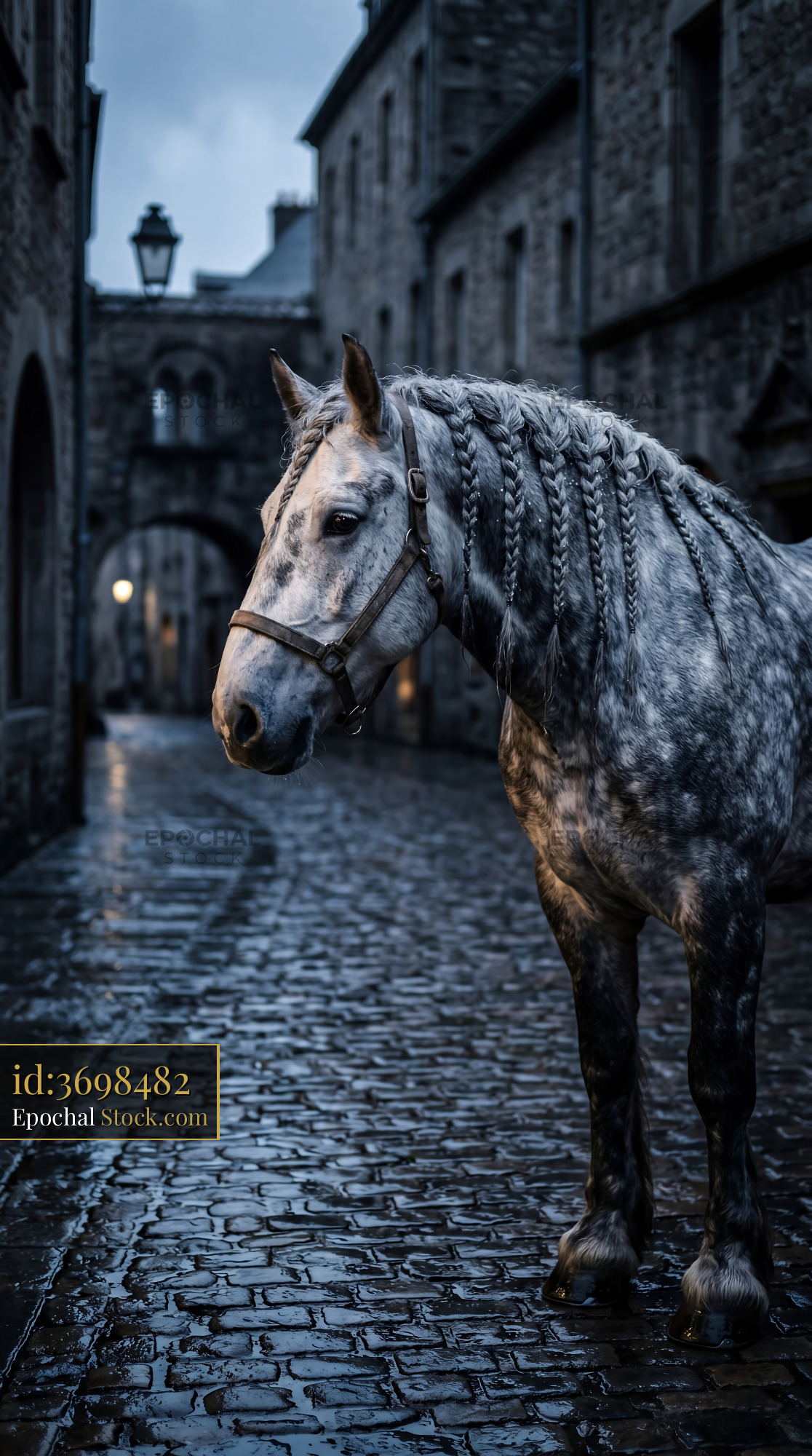 This seamless pattern features a moody equine scene with a braided dapple grey horse on wet cobblestones. Ideal for dramatic statement wallpaper, dark academia home decor, or custom apparel.