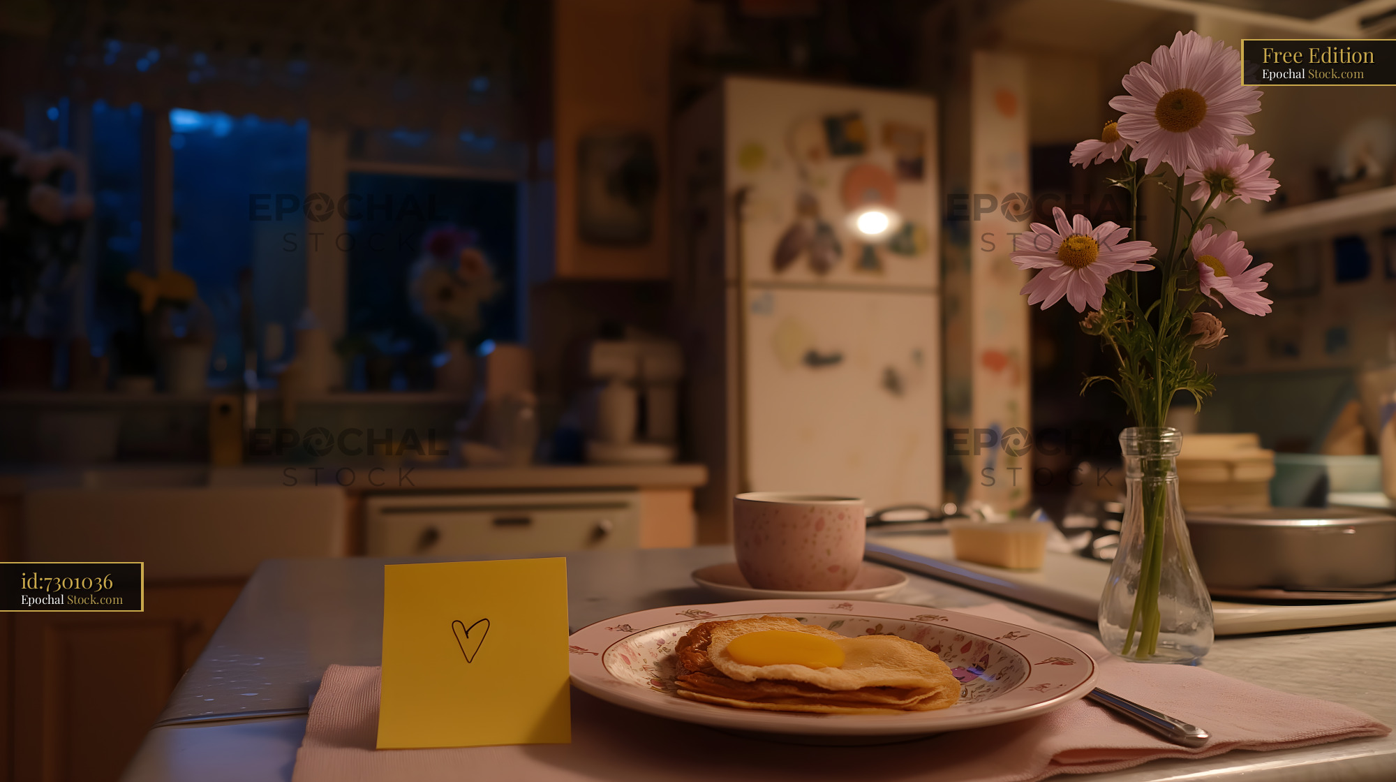 Breakfast on the table in a quiet kitchen at dusk Free Premium Stock Photo